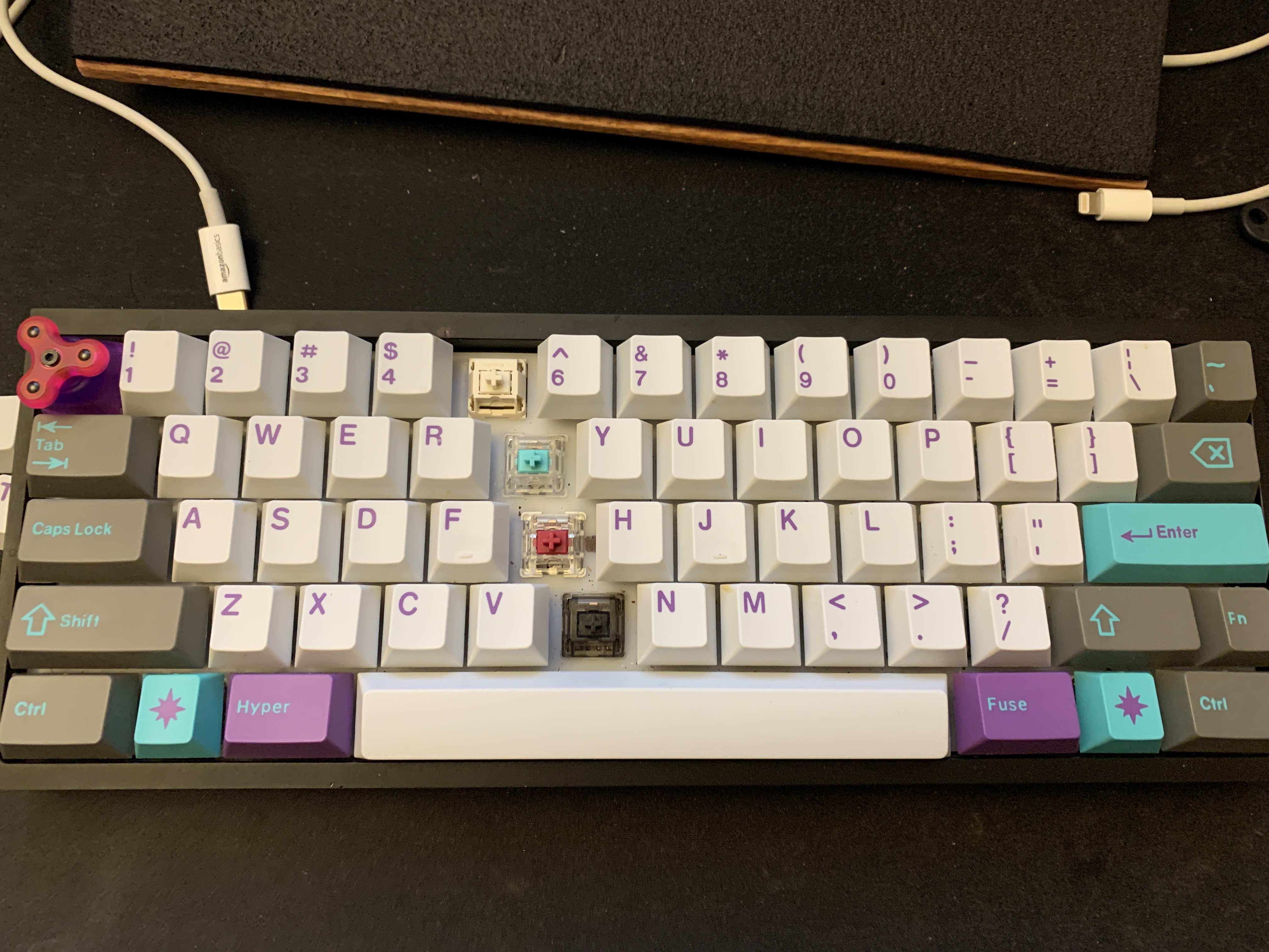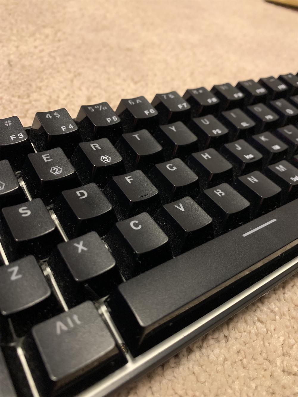 Lubed Black Gateron Inks: Lube: Krytox 205g0: Stabilizers: Genuine GMK Screw-In, lubed and clipped: Challenges / areas of note: The build process went a lot smoother the second time around - I didn't poke myself while installing switches onto the plate and PCB, I set the soldering temperature correctly, and none of the keys are double typing . . .