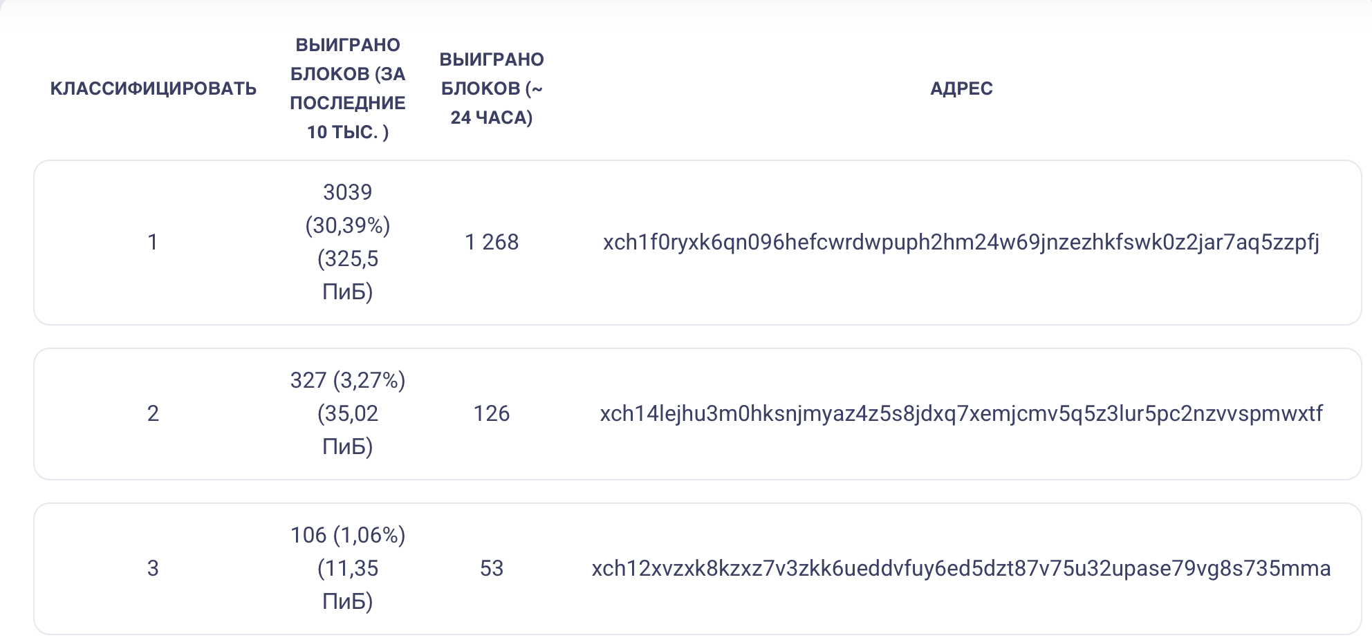 Лучшие фермерыТоп-3 адреса по количеству выигранных блоков. Фермеры могут направлять вознаграждения по нескольким адресам.