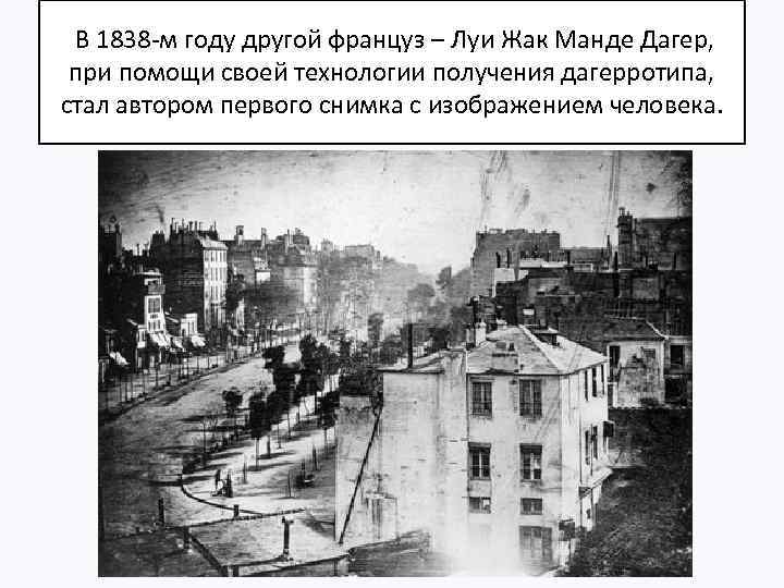 Изобретение Луи Дагер был химиком и изобретателем . Он придумал процесс фиксирования изображения, основанный на особой светочувст . Это первое дагерротипия человека… Бульвар, который заснял Луи Дагер на аппарат собственного изобретения кажется пустынным .