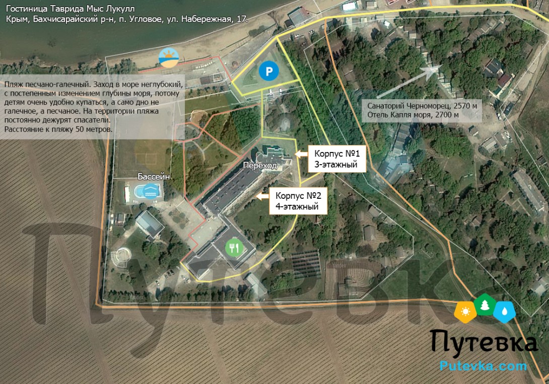 Курортный отель "Таврида Мыс Лукулл" расположен на юго-западном побережье Крыма, в поселке Угловое в 50 м от моря . Период работы: июнь-октябрь . Описание корпусов: Размещение в 3-этажном . . .