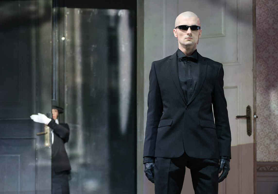 Еще один костюм в спектакле «Что делать» — это жесткий френч, строгие брюки, туфли с каблучком. И соответственно костюму пластика: осанка, размеренность, не позволяющая себе каких-то вальяжностей. Костюм, который не позволяет сидеть расхристанно и вести себя неподобающим образом, он обязывает.