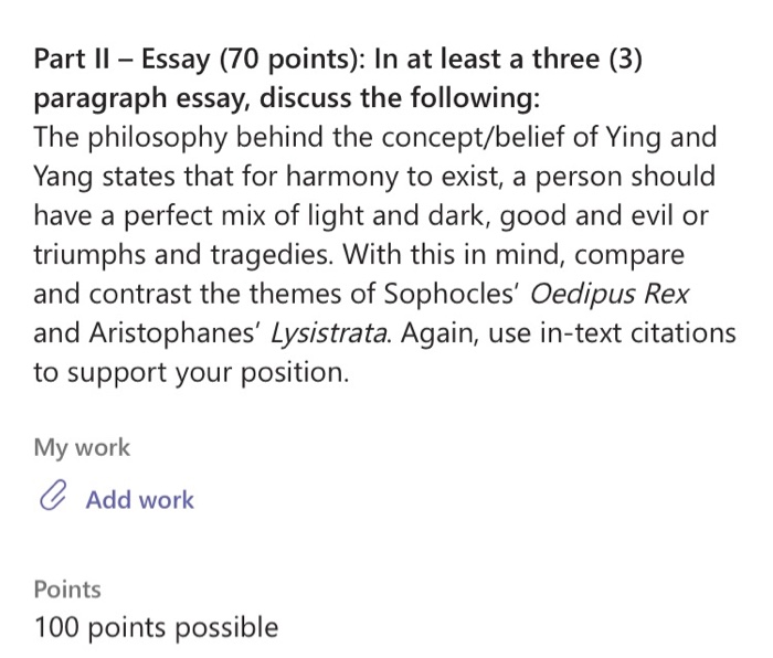 Lysistrata Essay Topics & Writing Assignments . This set of Lesson Plans consists of approximately 100 pages of tests, essay questions, lessons, and other teaching materials . The battle between men and women is the main conflict of the play, but this is not a theme which is limited to this time period . Part 1: How do you define the idea of the . . .