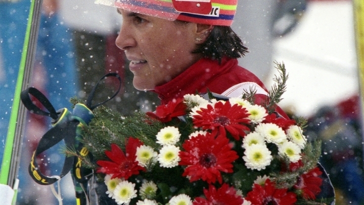 Российская спортсменка Любовь Ивановна Егорова выиграла Кубок мира по лыжным гонкам в Кавголово . 1994 год . Фото: РИА Новости