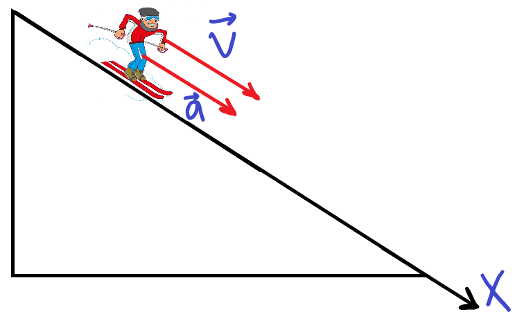Лыжник скатывается с горки двигаясь прямолинейно