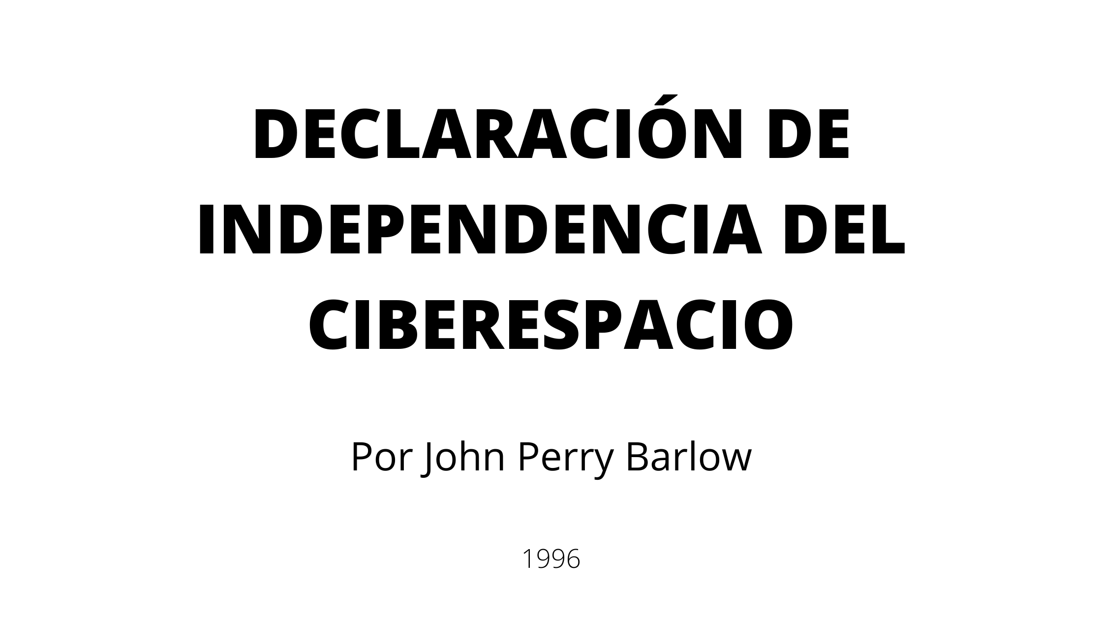 Declaro el espacio social global que estamos construyendo independiente por naturaleza de las tiranías que estáis buscando imponernos. No tenéis ningún derecho moral a gobernarnos ni poseéis métodos para hacernos cumplir vuestra ley que debamos temer verdaderamente.