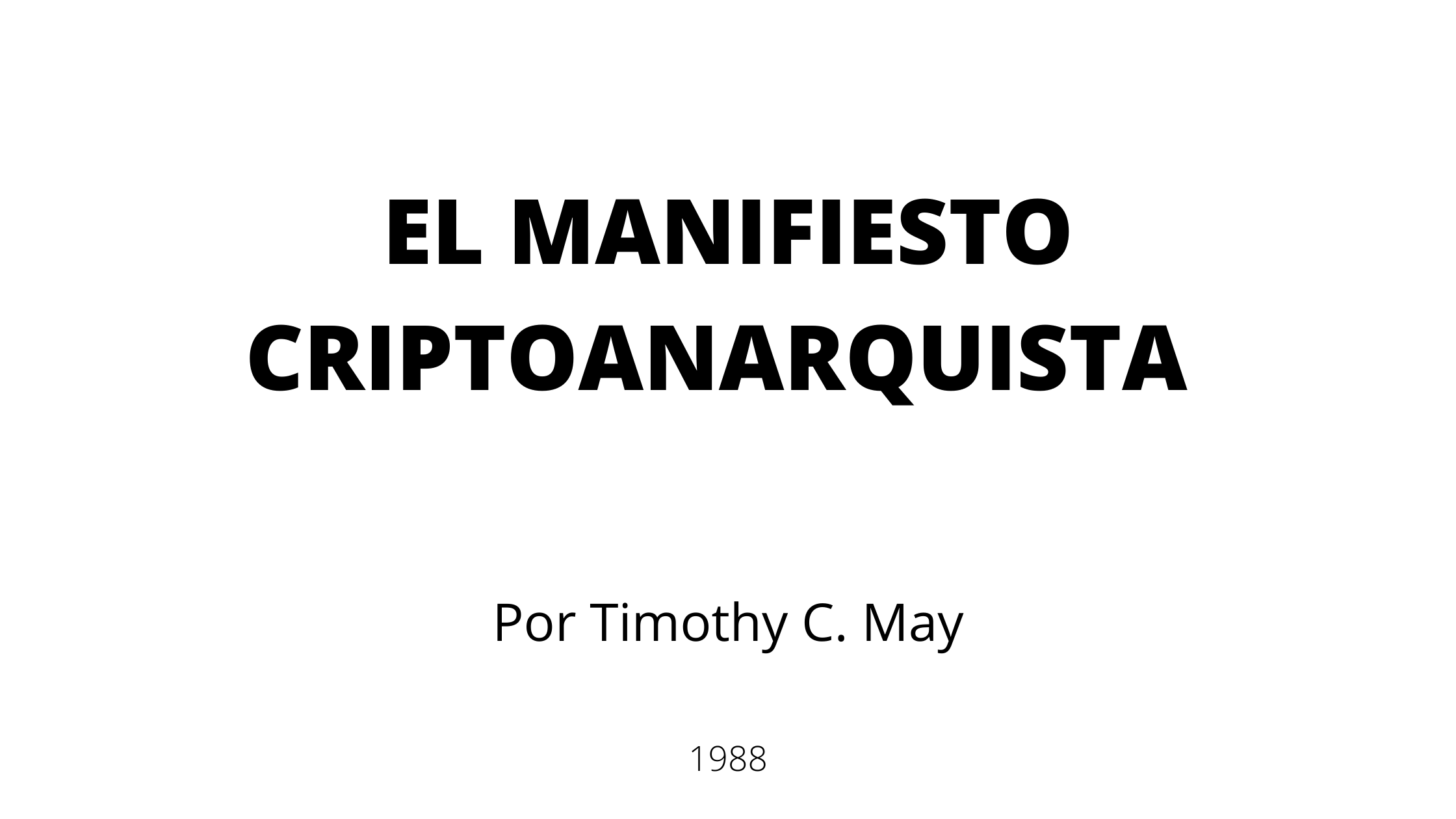 Aquí está el “Manifiesto Cripto Anarquista” que leí en septiembre de 1992 en la reunión de fundación. Sus orígenes se remontan a mediados de 1988, cuando fue distribuido a algunos tecno-anarquistas afines en la conferencia “Crypto ’88″ y de nuevo en la “Hackers Conference” de ese año. Posteriormente di charlas sobre esto en ‘Hackers’ en 1989 y 1990.