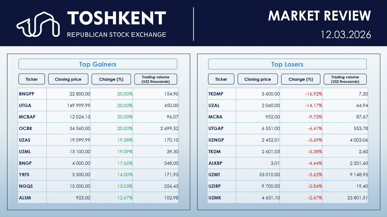Aggregate trading volume on Main Board – 963.12 mln UZS ($79.36 K)