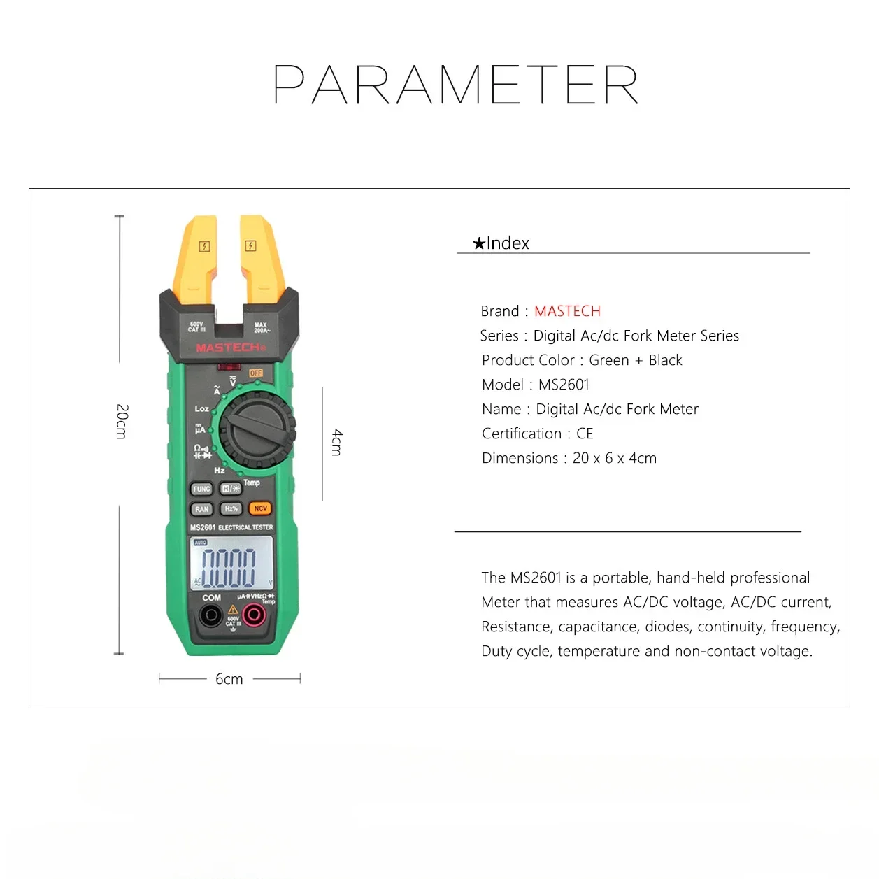 XLTFGLZQdUЗдесь вы сможете купить MASTECH MS2601 Digital AC/DC Fork Meter Clamp Meter LOZ Voltage Test Continuity Frequency Duty Cycle Temperature Multimeter с бесплатной доставкой до вашего почтового отделения.