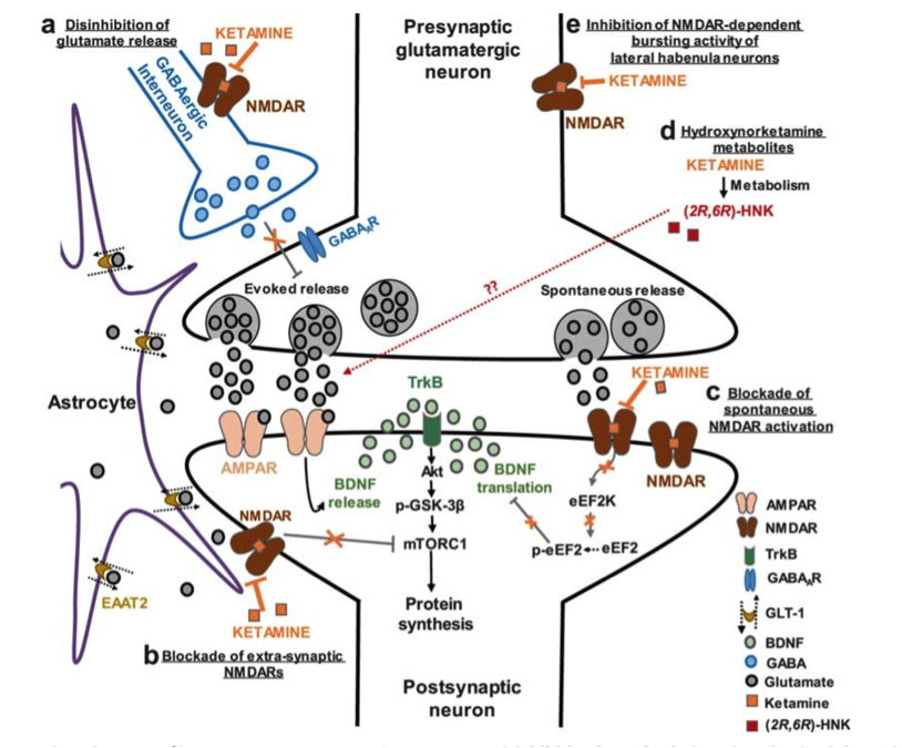Чтобы объяснить антидепрессивное (отсроченное) действие пытаются рассматривать активацию AMPA-рецепторов, метаболит 2R,6R-гидроксиноркетамин, и активацию мю опиоидных рецепторов. В любом случае всё в идеале стараются привести к синтезу нейротрофического фактора роста (он же BDNF), то есть вписать в контекст неопластической теории, которая сегодня считается наиболее универсальной и давно потеснила моноаминовую «парадигму». Это, к слову, далеко не всегда получается.