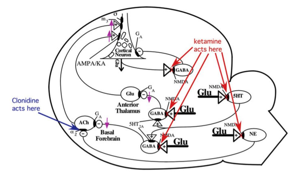 Что касается антидепрессивного действия — всё оооочень размыто. Известно, что субанестетические дозы кетамина ведут к развитию так называемой временной гипофункции NMDA-рецепторов (NRHypo), состоянию, обусловленному частичным блокированием NMDA-рецепторов ГАМКергических нейронов. Ингибирование последних ведёт к так называемому «торможению торможения» (disinhibition). Если грубо, но по делу, ГАМКергические нейроны регулируют (тормозят) два ключевых пути, вовлечённых в процесс: холинергические нейроны первого находятся в базальных отделах переднего мозга, глутаматэргические нейроны второго — в передних ядрах таламуса. И те, и другие оказывают стимулирующее воздействие на пирамидальные нейроны коры. Однако подобный механизм соответствует диссоциативному действию кетамина (если кто-то сможет вдруг мне объяснить чем psychotomimetic отличается от dissociative в контексте употребления кетамина (а не просто клиники), будет вообще классно, пока я нашёл только такое ). Но у нас же концепция, что помогает не потому что «штырит». Здесь начинаются бла-бла-бла.