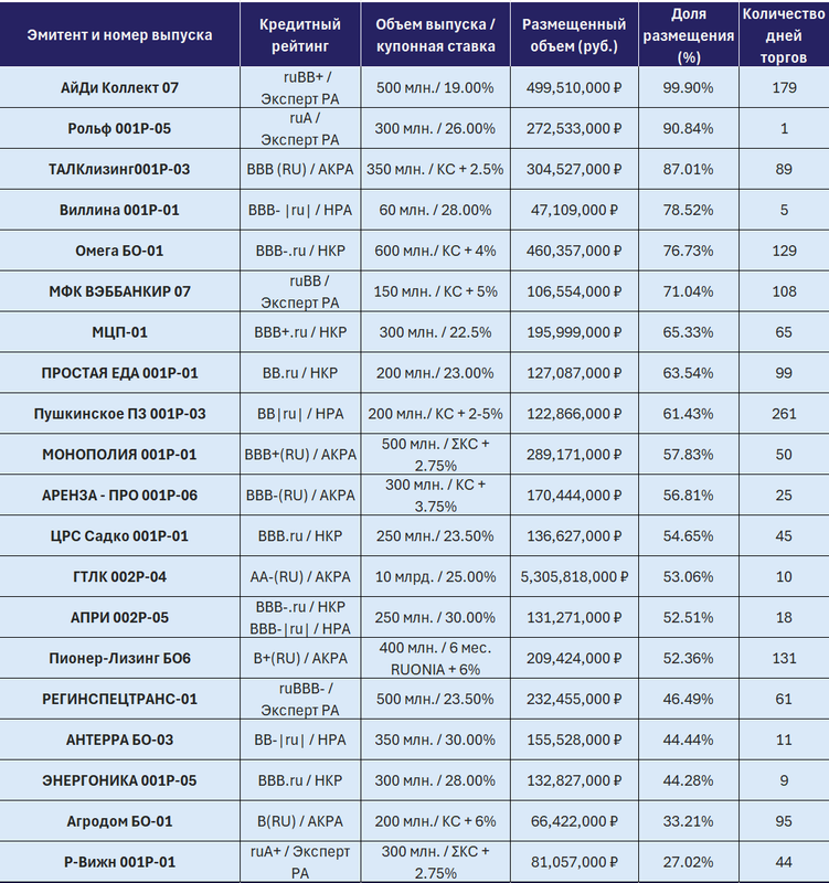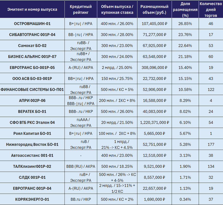 🔸 Большое количество эмитентов досрочно завершило размещение своих выпусков. В их числе: БЭЛТИ-ГРАНД (61,67%), ТРАНСПОРТНАЯ ЛИЗИНГОВАЯ КОМПАНИЯ (18,42%), БИЗНЕС АЛЬЯНС (42,4%), ВТБ-ЛИЗИНГ (7,76%). ПАО КОКС, ГПБ-ФИНАНС и НОВОСИБИРСКАЯ ОБЛАСТЬ размещения своих выпусков перенесли на неопределенный срок.