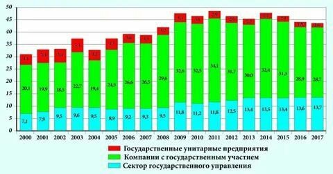 Во-вторых, доля государства в экономике на протяжении нулевых росла. К концу второго срока Путина она выросла на 10% по сравнению с началом его правления. Из причин можно выделить банкротство ряда предприятий, скупку государством акций частных компаний, льготы государственным предприятиям.