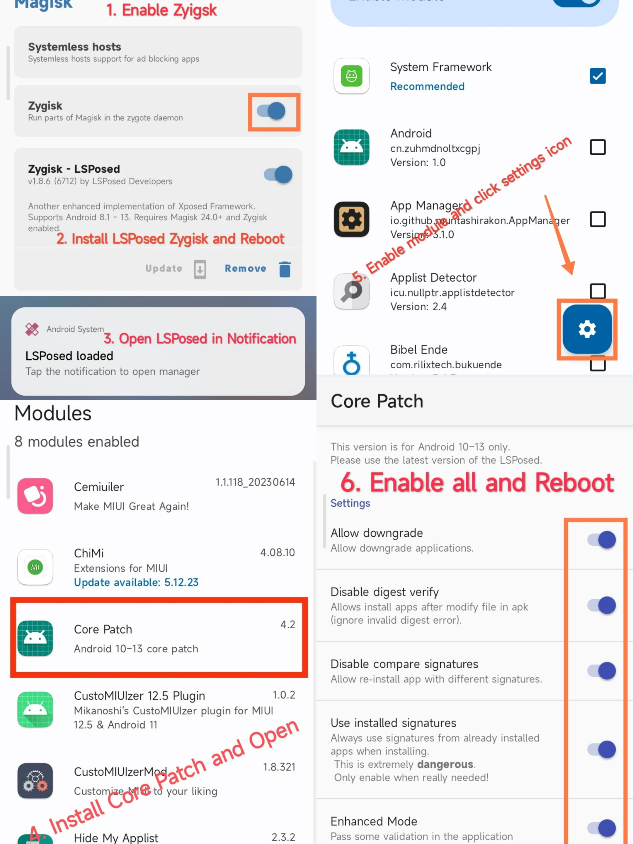 Requirements must have installed LSPosed, and installed Core Patch.