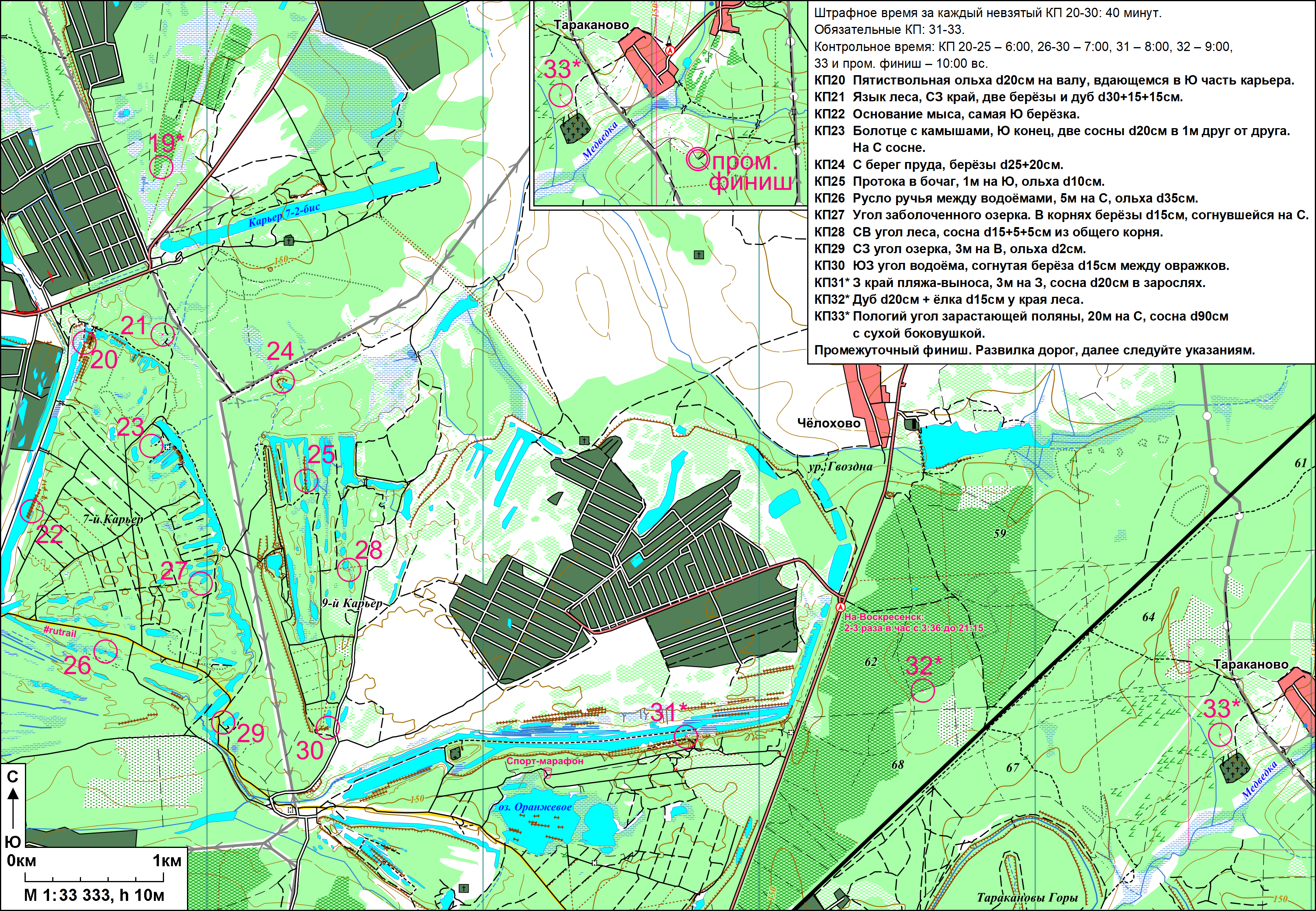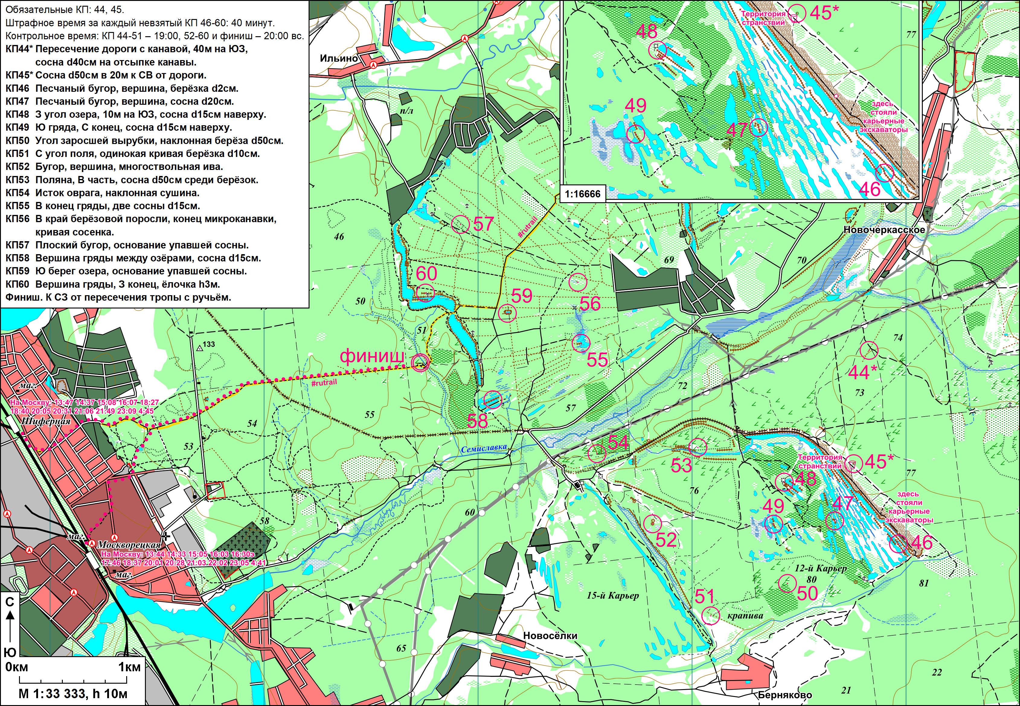 На финальную часть карты – вторую сторону третьего листа – с самого начала наметился план, подразумевающий отказ от первого облака, сразу за питьевым пунктом Территории: окрестности этих карьеров были мне неплохо известны, и шариться там в описываемый момент никакого желания не было. Шут с ними, с теми КП, говорил я себе, иди от 45 сходу на 53 и 54, и будет у тебя приятнейшее предфинишное облако 55-60, близкие друг к другу точки в замечательном лесу – тоже хорошо знакомом. Но, как известно, ммбшник предполагает, а бубен Тониса располагает: выходя с 54-го КП, я споткнулся – и осознал, что голеностоп все той же правой ноги начало накрывать точь-в-точь как год назад.