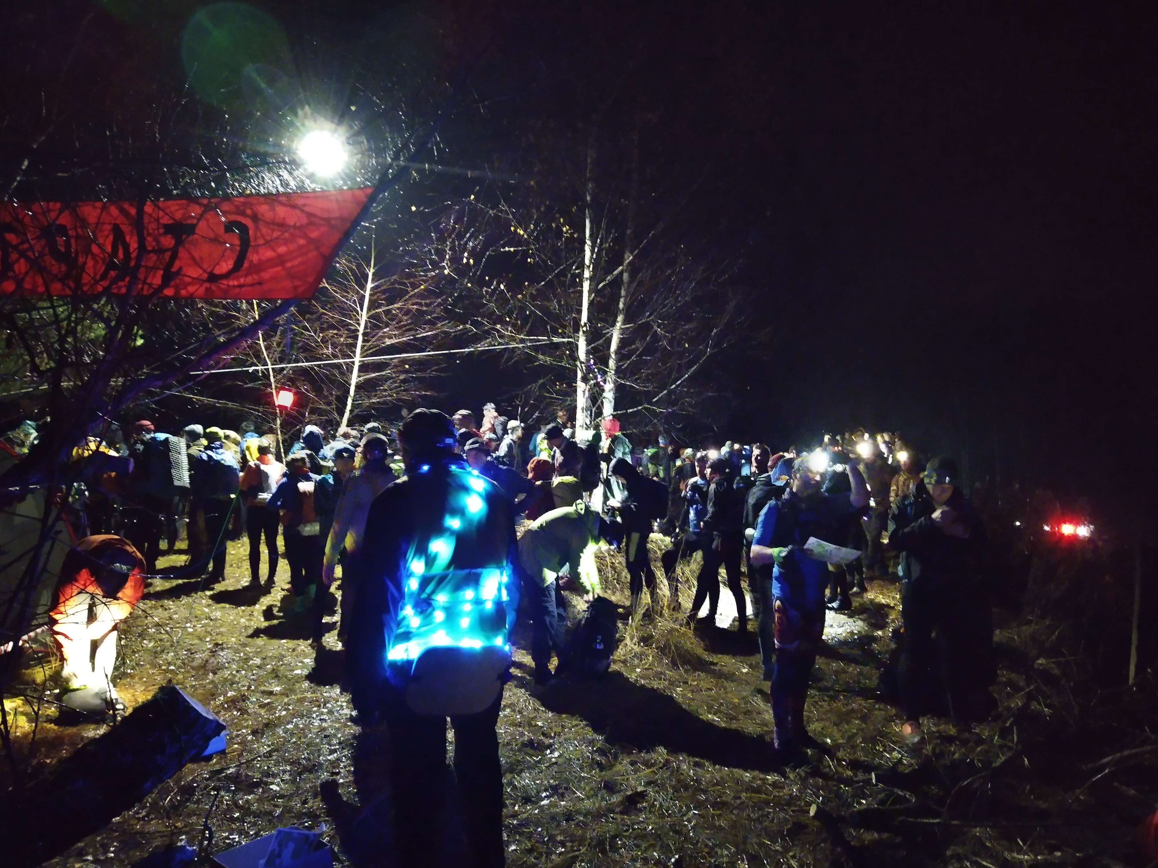 Все в результате было взято согласно плану, но вот сказать про этот отрезок пути что-то кроме «отвратительно» и «страдание» особо нечего:). Хотя ладно, до КП22 было еще туда-сюда, а вот потом – полная жесть. С отмерзшими руками сложно радоваться чему бы то ни было, а там и так было почти нечему: лужи под ногами становились глубже и грязнее, смеркалось, а до прома от момента выхода на условную прямую к нему было еще 10 верст, и все в абсолютно прямом смысле лесом. Хотя два повода улыбнуться все же случилось: первый раз – когда подтвердилась гипотеза, что с 29 на 30 имеется протоптанная тропа напрямую, и второй – на последнем в этот день питьевом КП от Спортмарафона (очень хотелось найти на нем костер, но и без костра точка с горячим чаем и ждущими тебя людьми ценна по умолчанию, а в тех условиях – особенно). В 19:23 был взят последний КП перед промфинишем; дорога дальше проходила задами деревни Тараканово, навстречу с прома тащились усталые участники, очевидно, на автобус или такси в это самое Тараканово – и вот честно, я всерьез думал, что вскоре присоединюсь к ним, так как метода поставиться и не затащить в палатку кучу насквозь мокрых вещей придумать не мог.