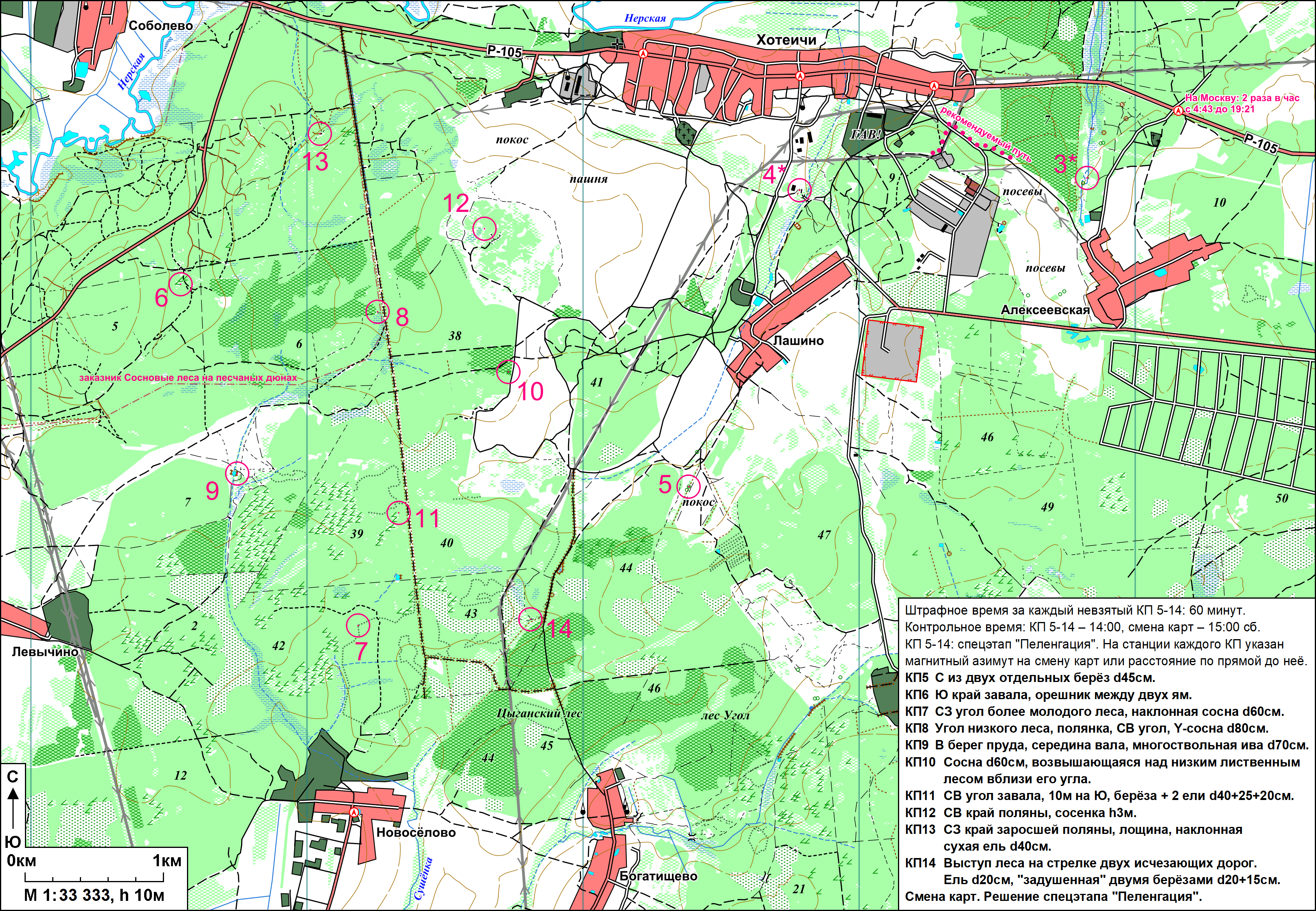 На точке Спортмастера (непривычно видеть их флаги на ММБ, но здорово, что пул поддерживающих мероприятие растет!) хорошо: здесь не только чай с печеньями, но и горячий бульон. Народ, сидя вокруг точки на рюкзаках, определяется с порядком взятия «облачных» КП. Говорят, что смена карт может быть либо с одного края карты, либо с другого. Хмм, но ведь от этого зависит, в каком порядке лучше собирать облако… Сижу, прикидываю и так и эдак – подсознательно хочется начать обход с севера, и если СК на юго-востоке, это точно удачная мысль, а если где-нибудь на западе? Быстро вспоминаю, что у нас в той стороне: поселок имени Цурюпы, здоровенная такая населенка, через нее дальнейший трек явно не ведет. А если обходить его с юга? А там лес скоро кончится, начнутся пустоши с населенкой, а потом железка, а потом уже Москва-река – не, сюда оставшиеся даже до прома километры явно не влезают. А если дальше не на юг, а опять на запад, за Нерскую? Я, конечно, ни одного моста там не помню, но броды вроде были… Но – опять уверенное нет: за Нерской уже «ракетный лес», полигон двигателистов, там дистанцию точно негде проложить. Значит – юго-восток, точно юго-восток, а сейчас – начинаем с севера! Рисую себе маркером на карте цепочку взятия: 10-12-8-13-6-9-11-7-14-5. Рисовать стоит, когда ходишь один – прям нужно; забыть про какой-то КП в стороне довольно нетрудно.