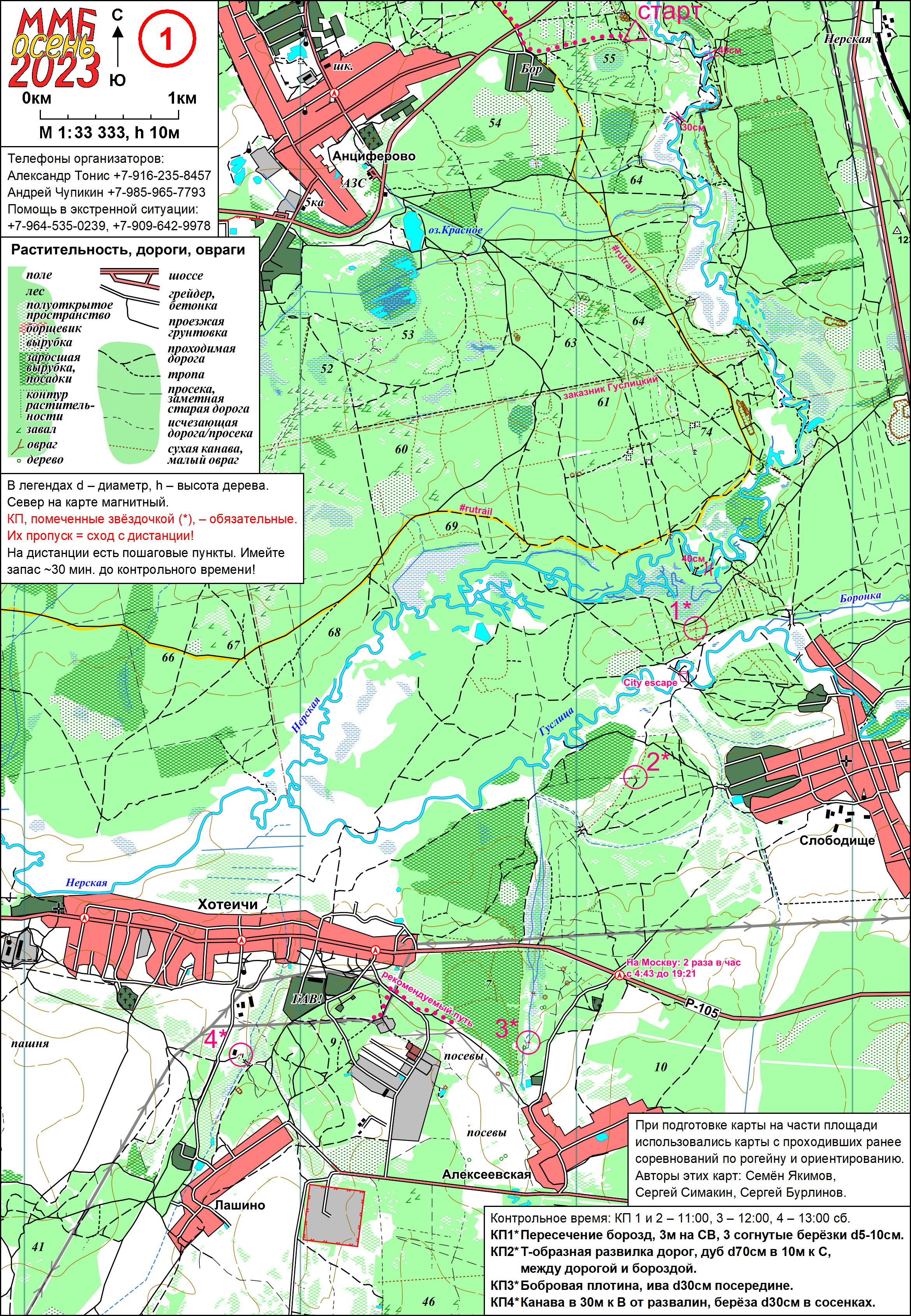 Что еще осталось из общих сведений? Схема; она выкристаллизовалась уже довольно давно. Дистанция умещается на 3 двусторонние карты, первую ты получаешь на старте – на ней сколько-то линейно расположенных КП, и первое облако. Вторую выдают на смене карт – туда лидеры попадают еще по глухой темноте, а средние пешеходы обычно приходят утром субботы. На второй карте тоже будет «линейка» и облако, а еще именно на нее чаще всего выпадает спецэтап – ряд КП не отмечен на карте, и для их взятия нужно сделать что-нибудь эдакое. Решить математическую задачу, соотнести внешний вид одиночных деревьев в поле с их фотографиями, вклеенными в карту, или лесопосадки – с полосками на шкуре стилизованного тигра; осенью 2021-го отдельные кусочки карты были не то поменяны местами, не то просто сориентированы «не туда». Таких спецэтапов бывает и два, и больше; если на субботу выпало что-то простое, сюрприз может ждать и в воскресенье. Днем-вечером субботы ты добираешься до промфиниша, где время останавливается – до утра оно принадлежит тебе. В течение 3 часов утром воскресенья открыт старт, здесь выдается третья и последняя карта, на обороте коей без всяких загадок значатся волшебные буквы «ФИНИШ». Где-то перед ним вновь будет облако, до которого обычно ведет линейная часть. Впрочем, этой осенью облаков на третьей карте было 2, но небольших и не сильно разнесенных в пространстве, и второе находилось вообще вплотную к финишу. На этом, кажется, описание становится исчерпывающим даже по моим меркам:) можно и к повествованию об участии переходить.