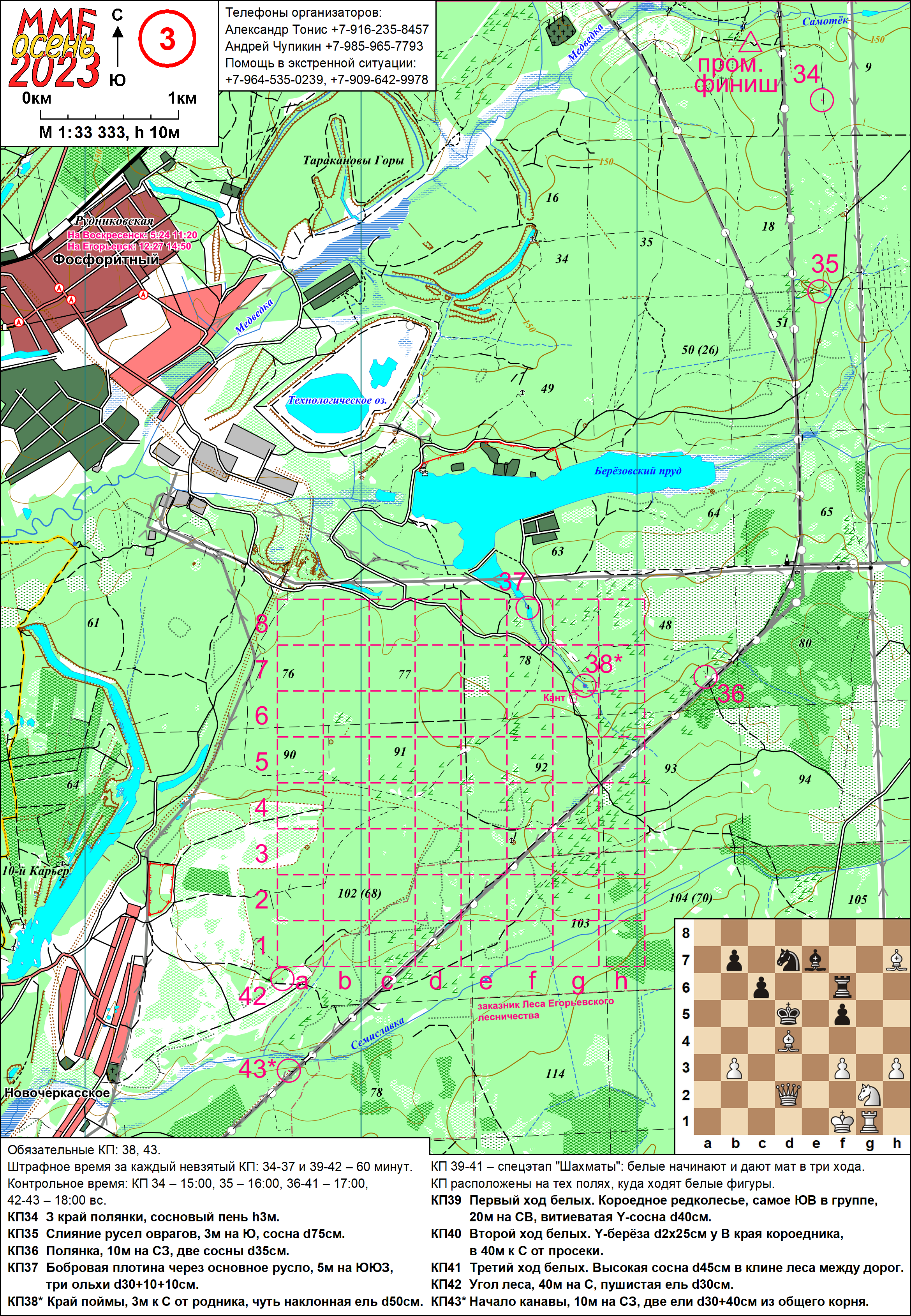 На следующее утро едва ли не вся МГУшная тусовка собиралась неторопливо – редкий случай и неплохое подтверждение исключительности погоды: обычно многие уже в 7-8 убегают на дистанцию, а сейчас народ в основном уходил в 9-9:30. В 9:50 получил свою третью карту и я; карта оказалась с сюрпризом – воскресный спецэтап! И не что-нибудь, а шахматная задача на мат в 3 хода. Я воодушевился: в шахматы когда-то поигрывал и процесс любил (от упражнений, конечно, отлынивал…), щас мы ее решим. Ответ и впрямь нашелся через несколько минут, вот только, шагая вдоль унылой ЛЭПки с КП35 на 36, я сообразил, что ни черта это не ответ: у черных явно были альтернативные варианты ходов. На ходу искать правильную комбинацию не получалось, и я уже подумал было забить, но на питьевом КП КАНТа обнаружились не только бутерброды с кабачковой икрой и, чуть позже, снова встреченная команда Лизы, Ромы и Наташи – но и магнитная шахматная доска, около которой зависали участники. С доской-то проще, подумал я, и (уже имея подтверждение от ребят, что исходный вариант «решения» к успеху не ведет) довольно быстро пришел к варианту правильному. Кстати, очень красивая трехходовка, даже моего скилла хватает, чтобы это оценить. Шах конем, блокирующий королю одну из возможностей отхода, вскрытый шах, жертва, которая не жертва – снимаю шляпу. Правда, на КП40 («второй ход») я все равно не пошел – времени было уже порядочно, а он лежал заметно в стороне, но все равно приятно было понимать, что нашел-таки верное решение.
