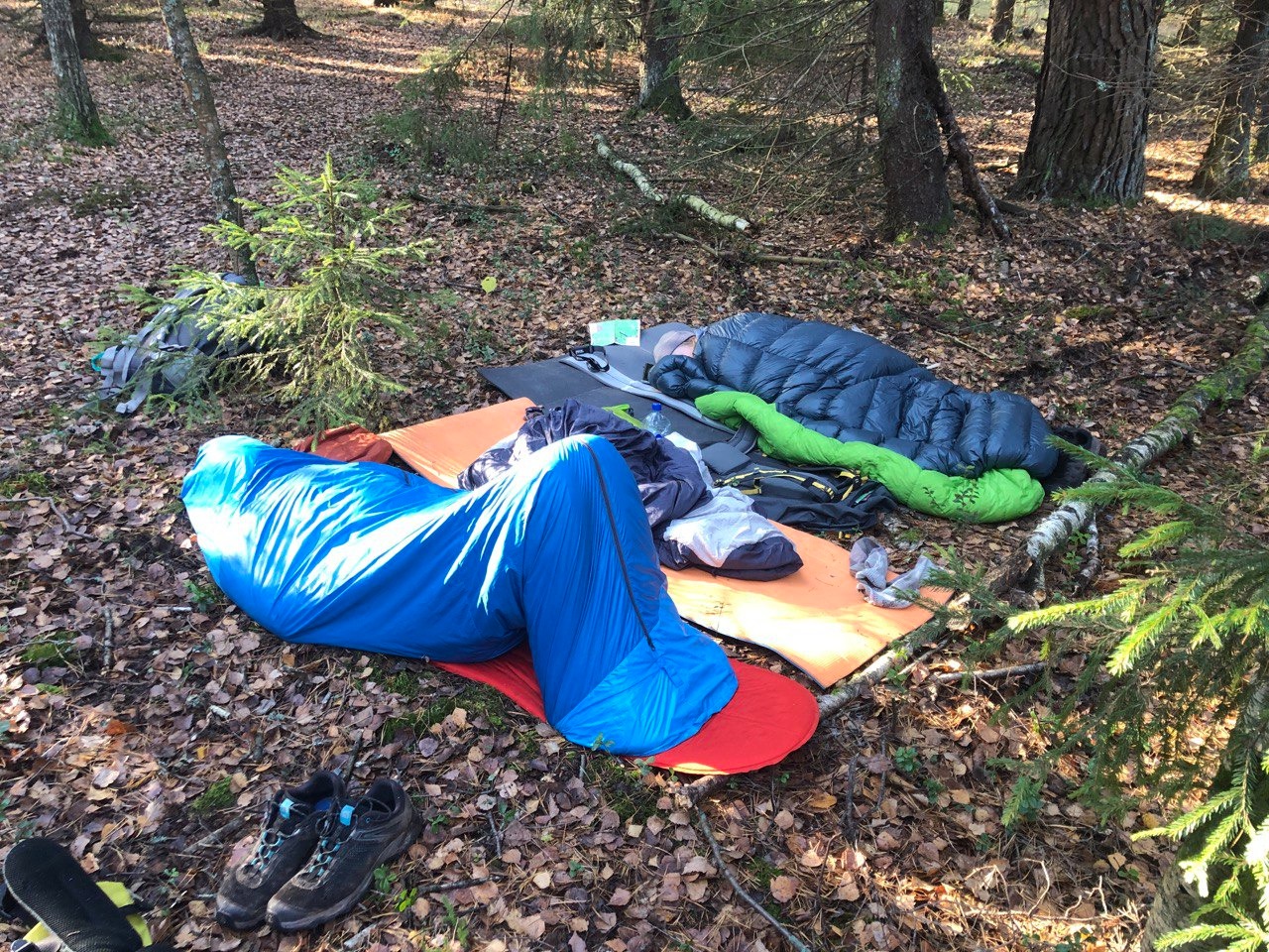 …вечер четверга выходит суматошным. Под начинающимся снегопадом в 11 вечера забираю у Артема одалживаемую мне снарягу: надувастик (340 грамм, ощутимо легче и компактнее моего самонадувастика) и пуховую слоновью ногу – 390 грамм, сворачивается в нечто неприлично маленькое. На этом фоне слегка досадно, что беру палатку целиком: это чудесное укрытие, уютное и так-то весьма некрупное в упаковке, вот только весит два кило. Но тут извините: геройствовать, ночуя под тентиком или спасодеялом, как это делают true ммбшники, я не готов – чтобы нормально идти второй день, мне критически важен комфорт сна. Ладно, с легким рюкзаком схожу в другой раз (или в другой реальности), а сейчас и 7 намеренных на старте килограмм – весьма неплохо.