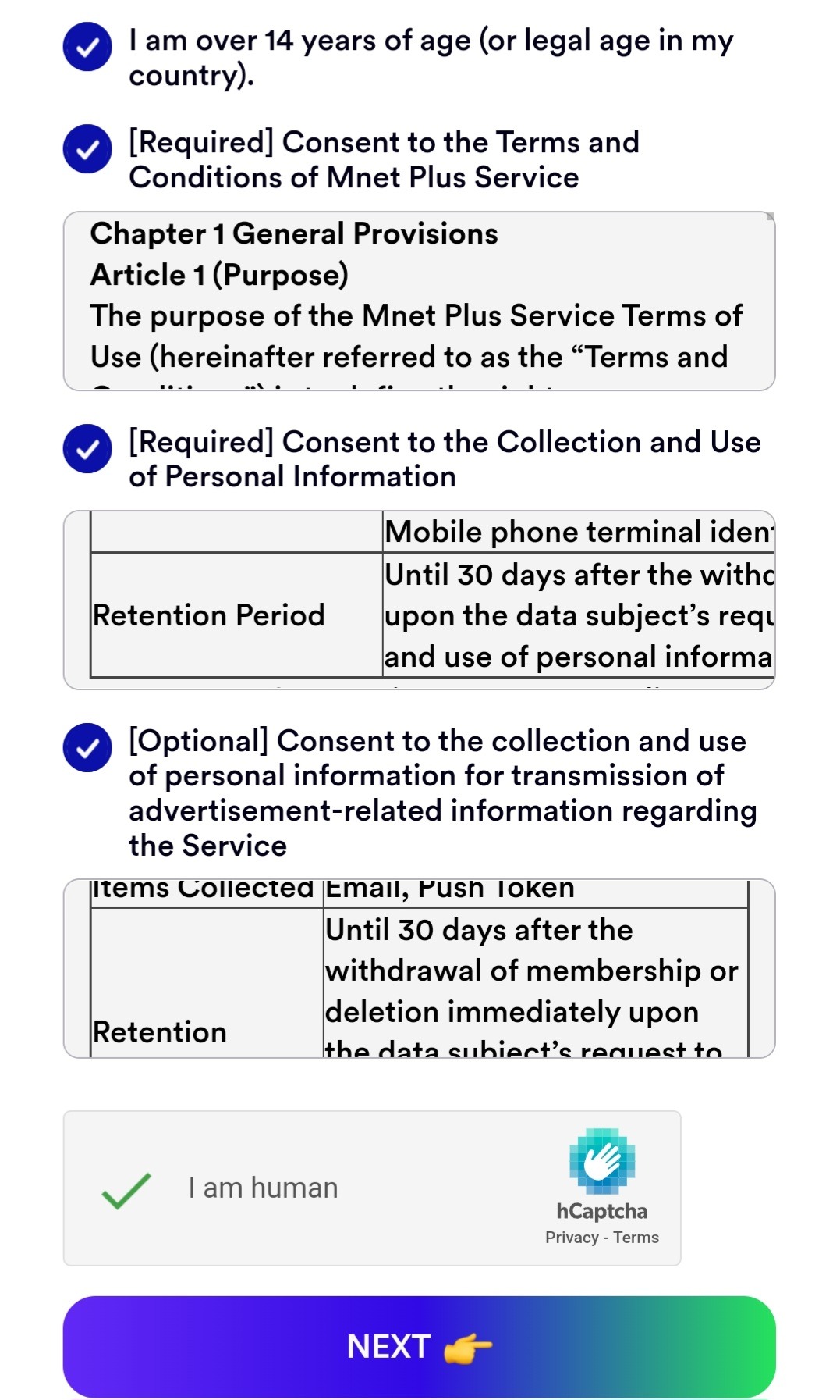 5. После удачного прохождения капчи, рядом с «I am human» появится зеленая галочка. Нажмите на «NEXT».