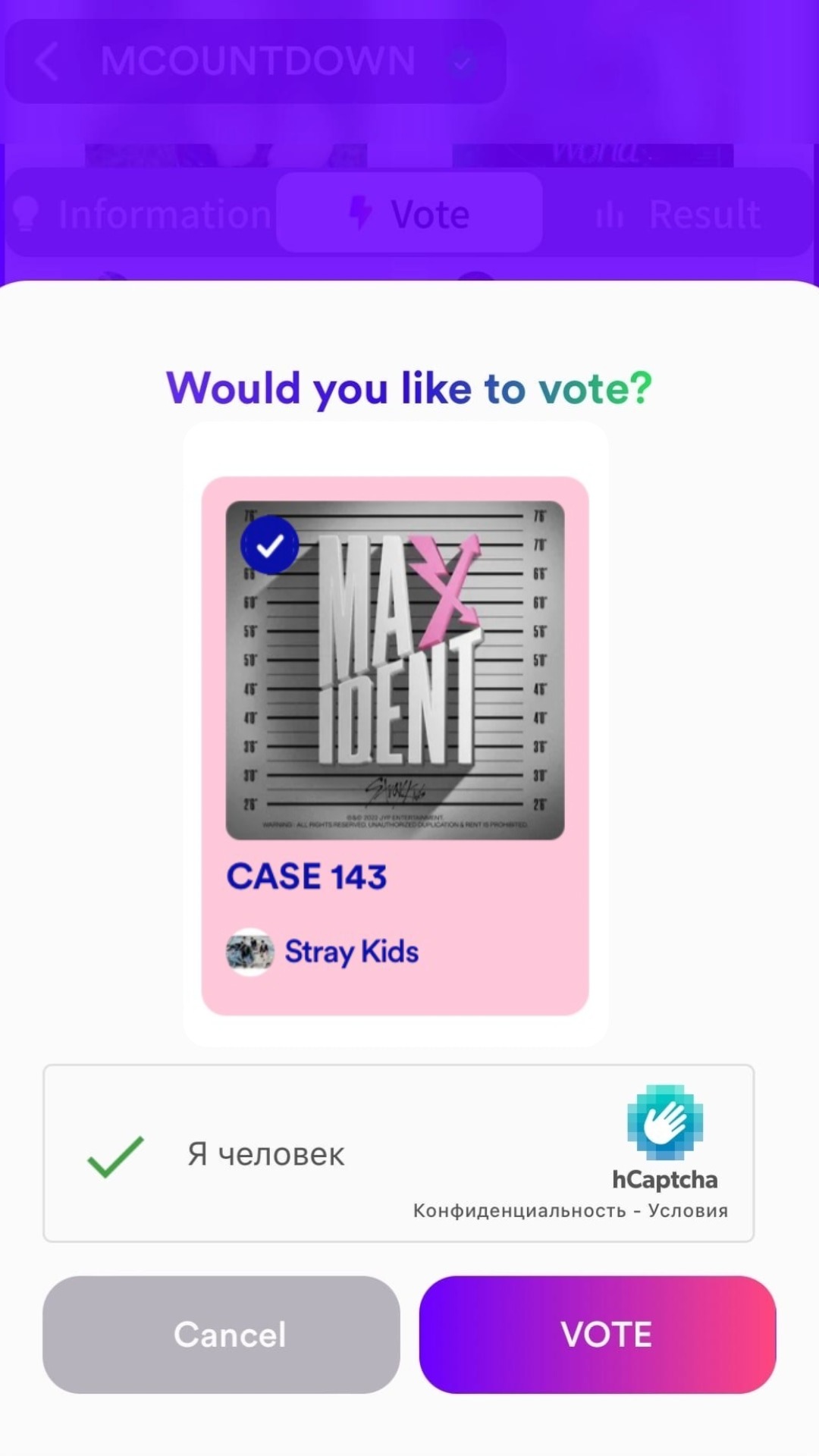 6. Выберите песню Stray Kids и пролистайте вниз. Когда пролистаете до кнопки «Vote», нажмите её.