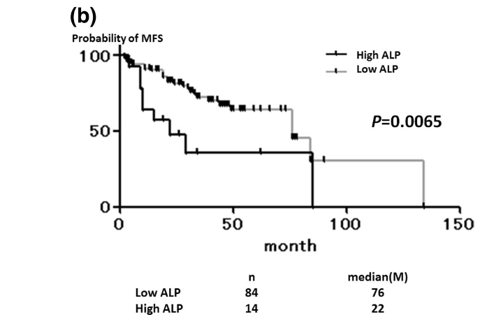 Высокий или низкий уровень ЩФ в данном исследовании определялся как >322 Ед/л или <322 Ед/л соответственно.