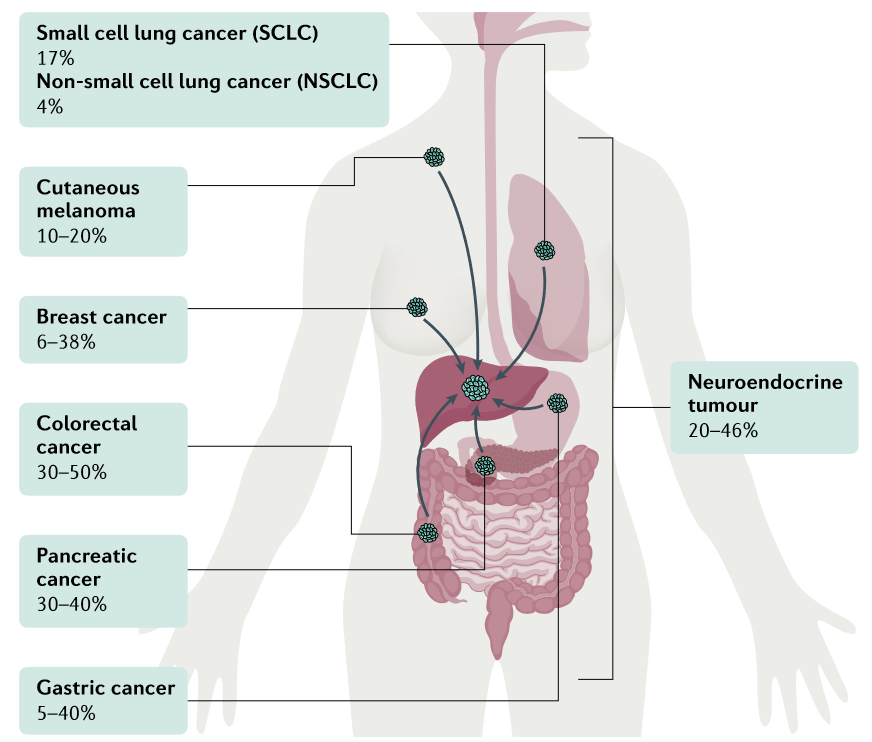 Чаще всего метастатическое поражение печени встречается при колоректальном раке, раке поджелудочной железы, лёгких и при раке молочной железы.