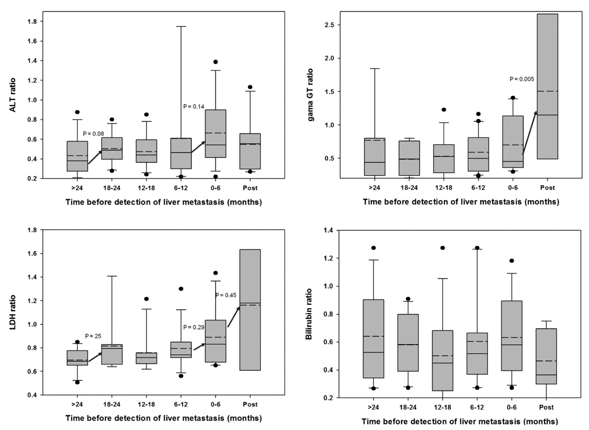 У пациентов меланомой была попытка проанализировать тренд динамики печёночных показателей до обнаружения метастатического поражения. С учётом малой выборки и других ограничений, убедительных выводов не получилось, динамика ГГТ и ЛДГ оказалась более наглядной, чем АЛТ и АСТ, однако в публикации звучит предложение о сокращении интервала наблюдения у пациентов с лабораторными отклонениями.