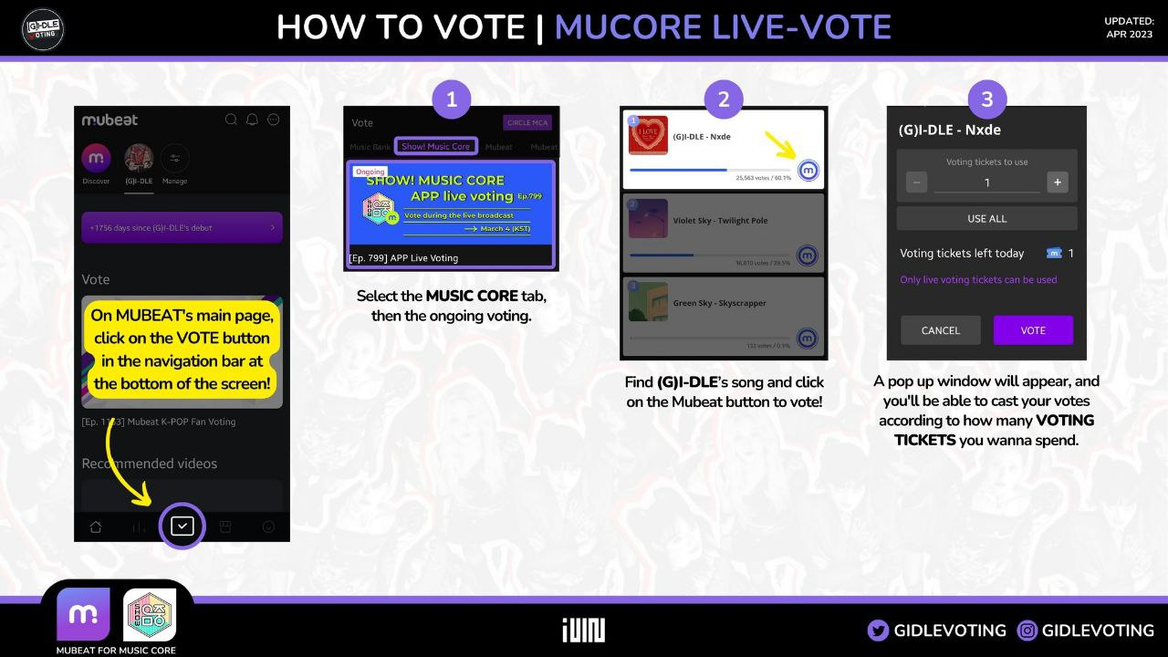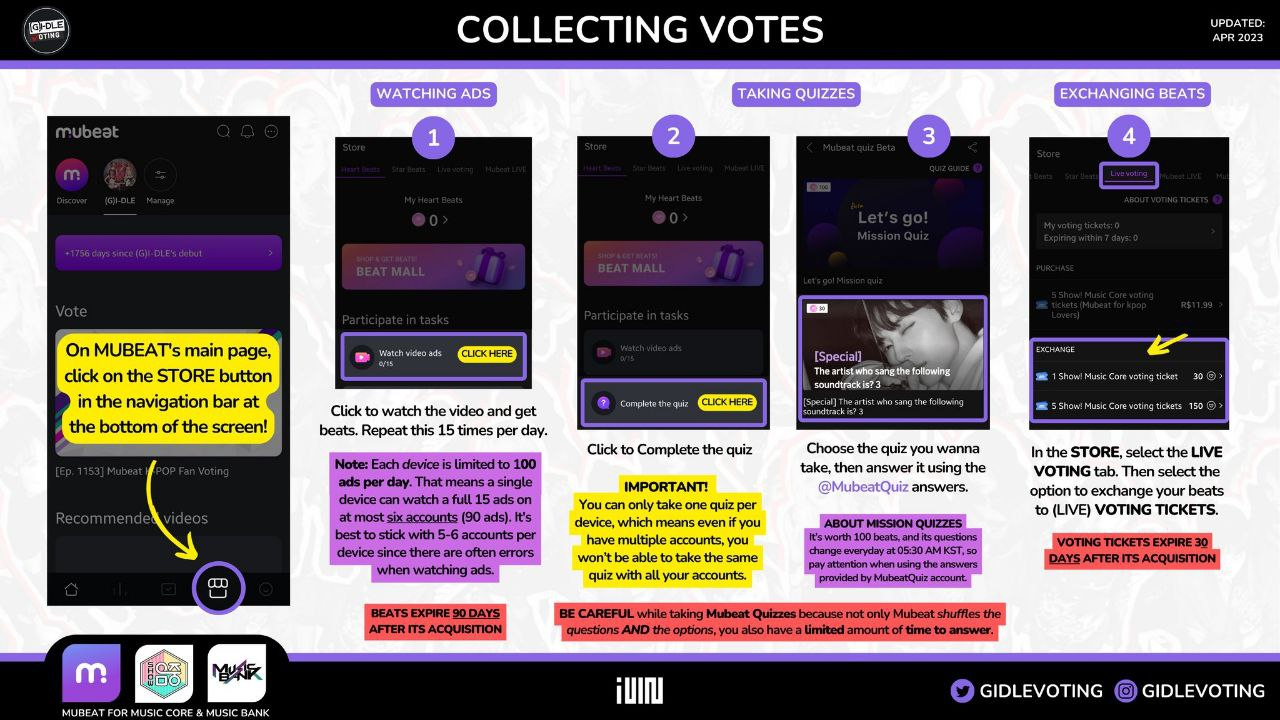 Голосовать на Mubeat довольно просто. Единственное, что мы настоятельно рекомендуем, - это обсудить стратегию с фанатами, прежде чем отказываться от своих голосов. Это потому, что не всегда лучше голосовать сразу, поэтому мы всегда голосуем в соответствии с нашими прогнозами - в зависимости от прогнозов, может быть, лучше занять 2-е или 3-е место в предварительном голосовании на одну неделю и занять 1-е место на следующей, например.