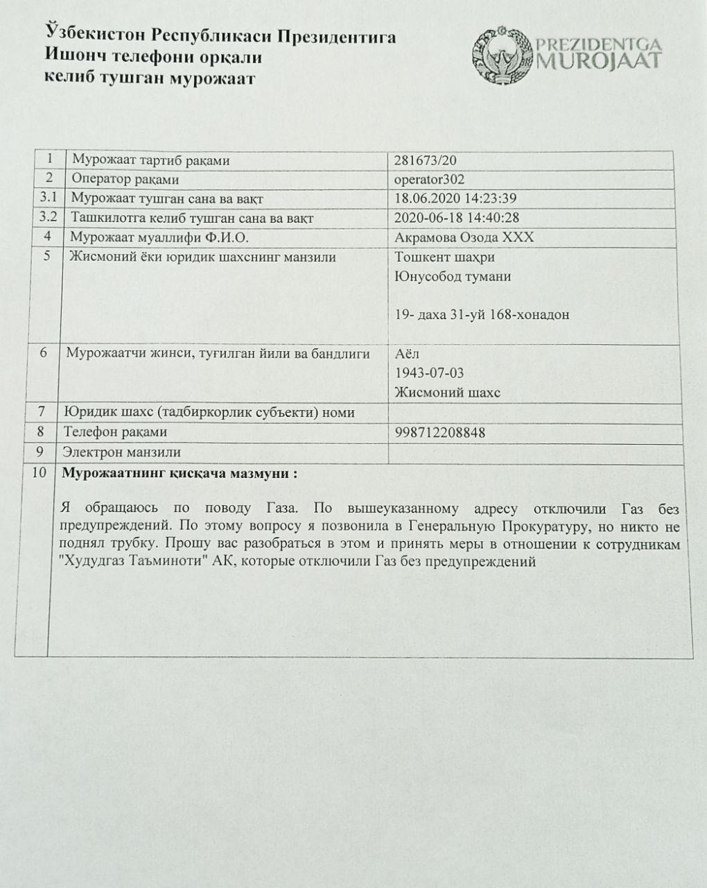 18 июнь куни Юнусобод тумани 19-даҳа 31 уй, 168-хонадонда яшовчи истеъмолчи Акрамова Озода томонидан огоҳлантиришсиз газ таъминоти ўчирилгани ҳақида эътирозли мурожаат келиб тушган.