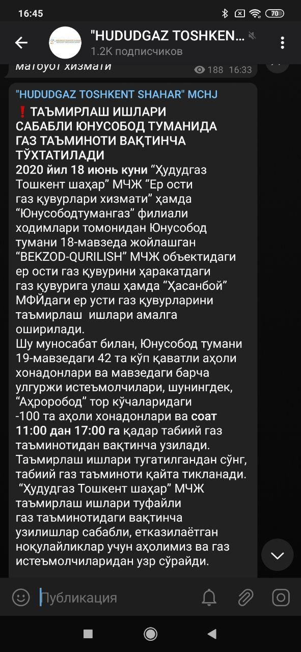 Ушбу марожаатга асосан “Ҳудудгаз Тошкент шаҳар” МЧЖ масъул ходимлари томонидан ўрганиб чиқилди ва қуйидагилар аниқланди. Яъни, 2020 йил 17 июнь куни (18.06.2020 кунидаги) Юнусобод тумани 19-даҳасида жойлашган “BEKZOD-QURILISH” МЧЖ объектидаги ер ости газ қувурини ҳаракатдаги газ қувурига улаш ҳамда “Ҳасанбой” МФЙдаги ер усти газ қувурларини таъмирлаш ишлари амалга оширилиши ҳақида Жамиятнинг расмий телеграмм ва фейсбук саҳифаларида эълон қилинди. Жумладан, Юнусобод туман хокимлиги матбуот хизматининг телеграмм ботига ҳам юборилди. (илова келтирилади).
