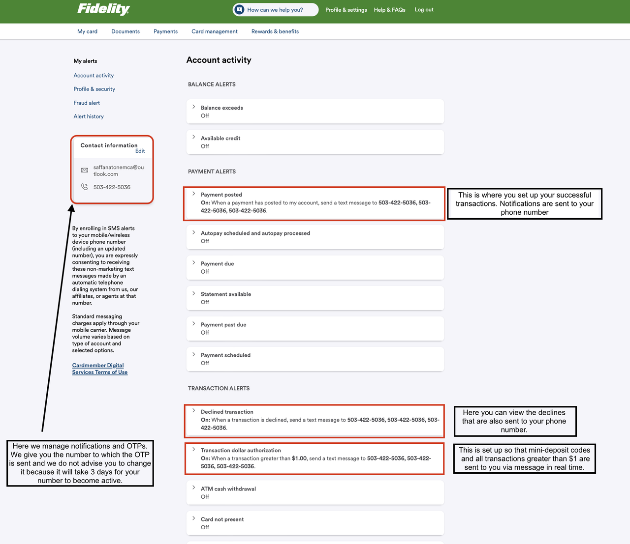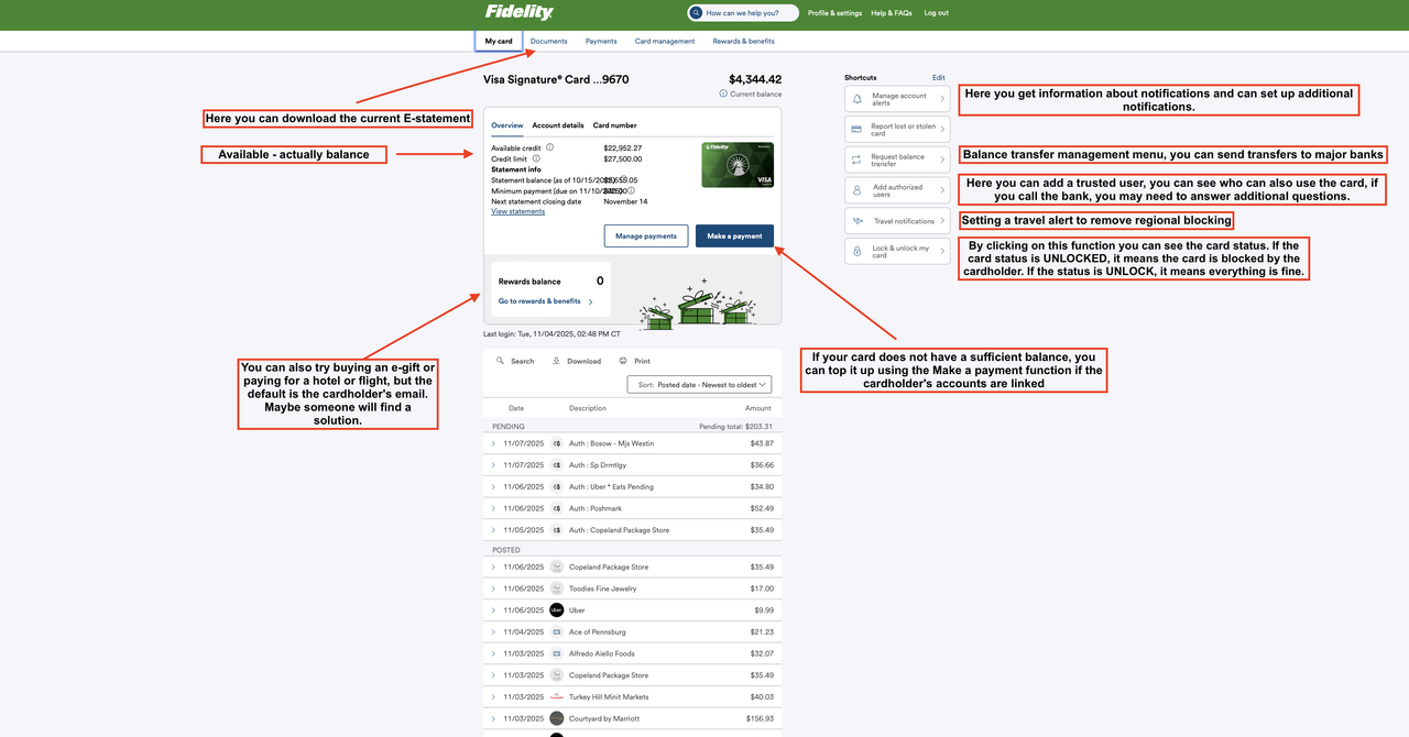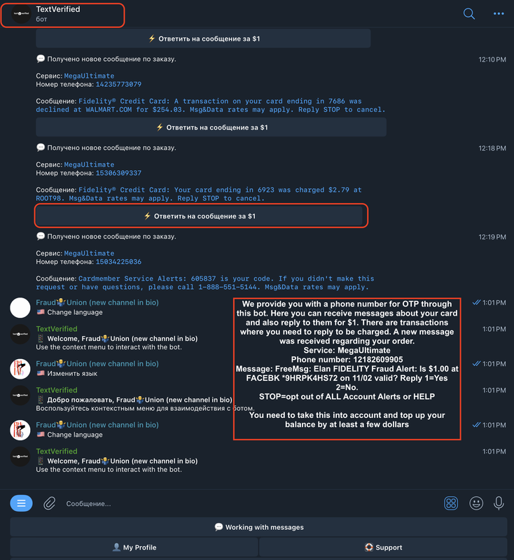 This is a screenshot of the main page with a detailed description. Here, we have provided comprehensive information that you can carefully review. However, please note that there are accounts where the side menu on the right is missing, possibly because the cardholder has restricted this option.This is the Account Alerts page, where you can see that it is possible to set up features such as mini deposits, as well as receive notifications about declines.This is a bot where you submit your phone number. You need to open the bot and send your Telegram ID or @username. We also recommend having a few dollars in your bot wallet, so you can reply to messages if needed, as shown in the example image.