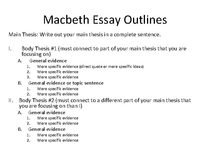 Macbeth Essay Outline Template . I . Introduction . a . Ask a question about the play that is likely to get the reader's attention . b . Briefly allude to the answer by noting some important details from the play that will support your main argument . c . Finish with your thesis statement βthe main point that your essay will make that answers the . . .