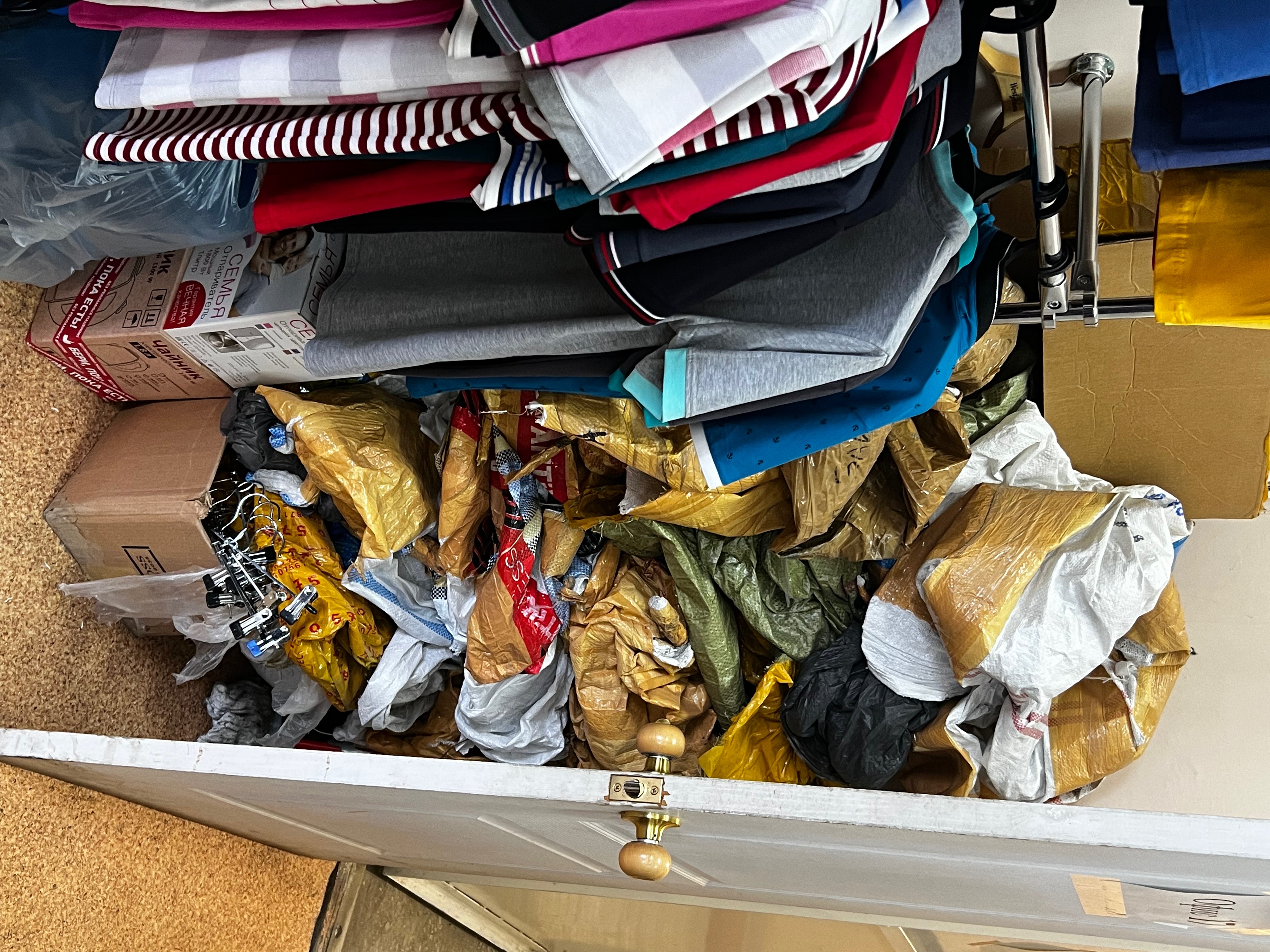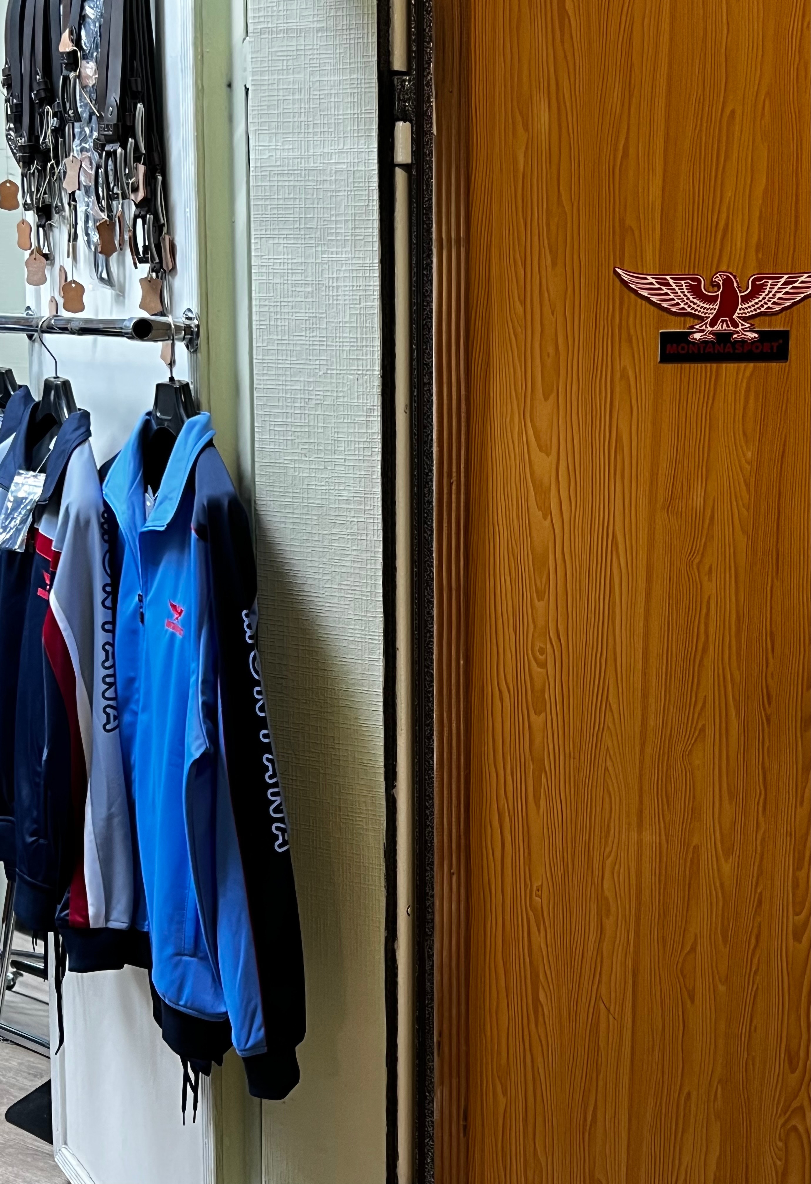 Далее мы попадаем в крошечную комнатку - храм бренда MONTANA. Ряды аккуратно сложённых джинсов, стены завешаны куртками и спорткостюмами.. У дальней стены восседает солидный мужчина, сразу видно - хозя. От него исходит неповторимая аура парня - челнока, прохававшего все с низов, с простого челнока, до хозяина точки на рынке, после и магазина а теперь прозябающего в забвении. Старая школа. Обращаю внимания, что нигде нет ценников, ну что ж нынче везде так.. цену надо спрашивать.