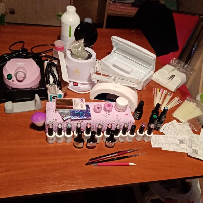 - материалы для наращивания ногтей: акрил для наращивания ногтей, типсы, формы, клей, гель для наращивания ногтей, праймер и подготовители ногтя,
