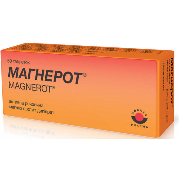 Магнерот - медикамент на основе микроэлемента магния, который участвует во многих процессах организма, включая обмен веществ . Помимо 32,8 мг магния препарат также содержит крахмал, целлюлозу, натрия цикламат, тальк, диоксид кремния, повидон К30 и лактозу . Показаниями к приему Магнерота являются: Патологии ССС, вызванные недостатком Mg в организме .