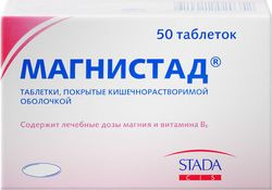 Магнистад - комбинированный препарат, способствующий восполнению в организме дефицита магния . Форма выпуска и состав Лекарственная форма выпуска Магнистада - таблетки, покрытые кишечнорастворимой оболочкой: белые, двояковыпуклые, овальные (в картонной пачке 5 контурных ячейковых упаковок по 10 таблеток в каждой) .