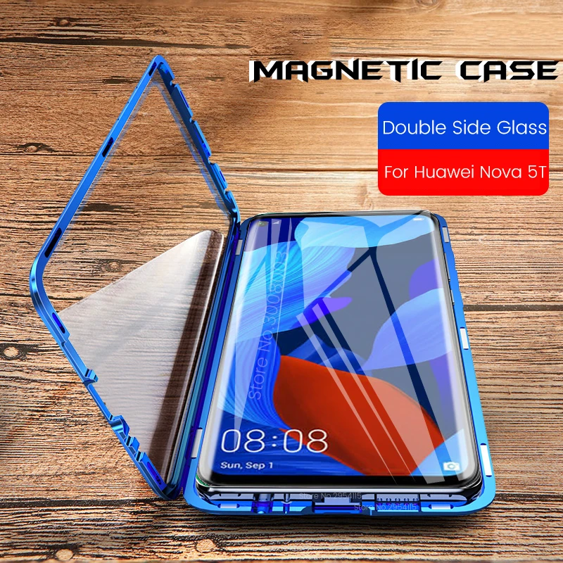 Магнитный чехол бампер MyPads Vetro magnete из закаленного стекла и металла для Huawei nova 5T с двухсторонней прозрачной крышкой металлический защитный противоударный синий Вид чехла: Бампер