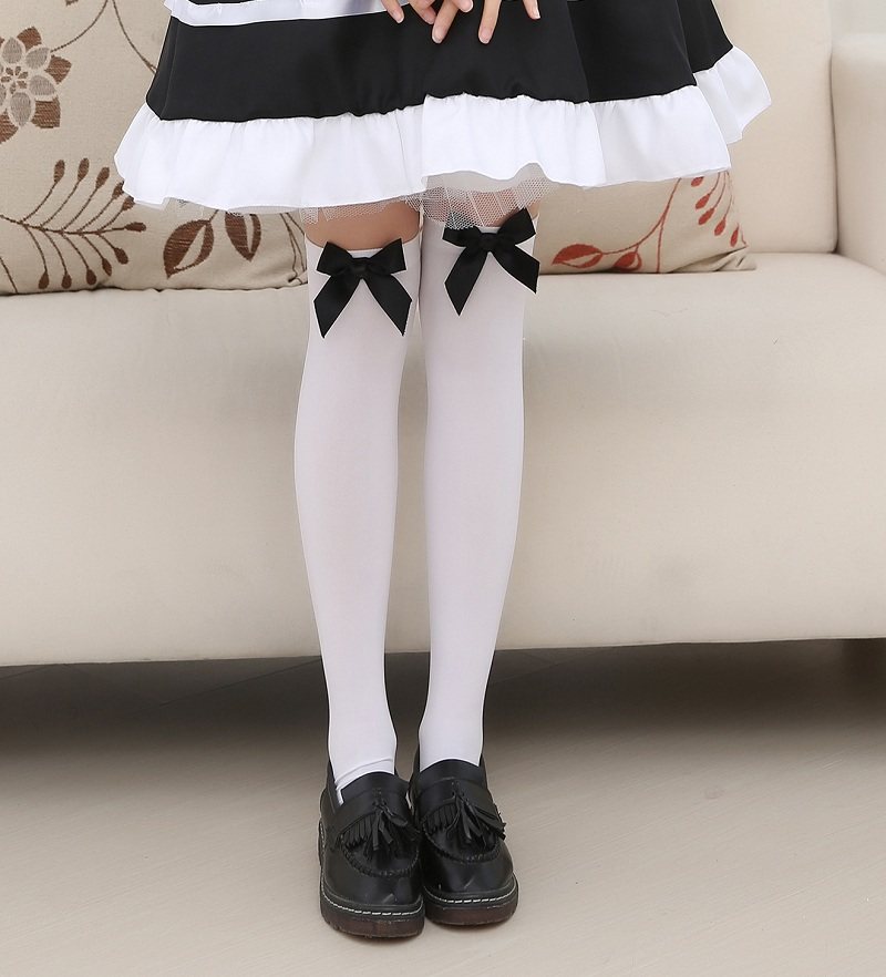 Maid Stockings . Item # 201109 (1) Maid Stockings . Included in delivery . One pair of maid stockings with black bows; Without skirt or shoes; Note . Size XL stockings come with black bows only . Product Description . Material . 100% polyamide . show more show less