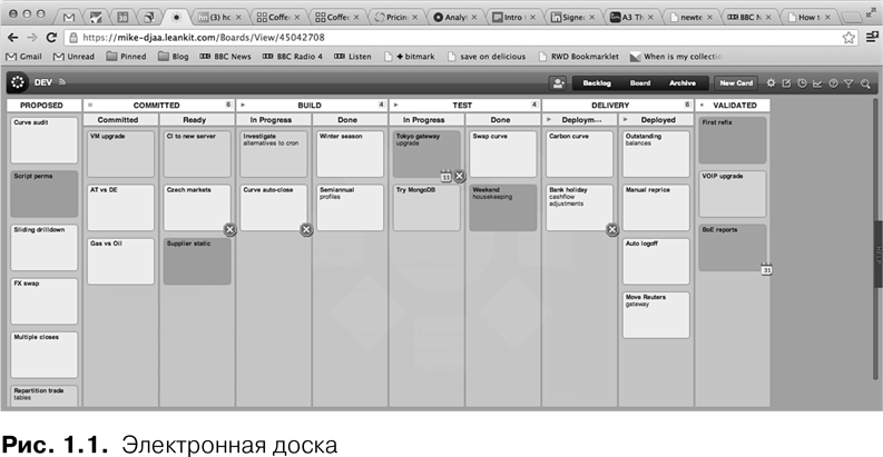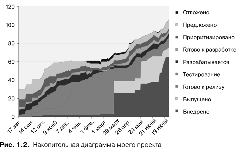 График на рис. 1.2 — это моя накопительная диаграмма потока (cumulative flow diagram — CFD). Я сделал ее следующим образом:
