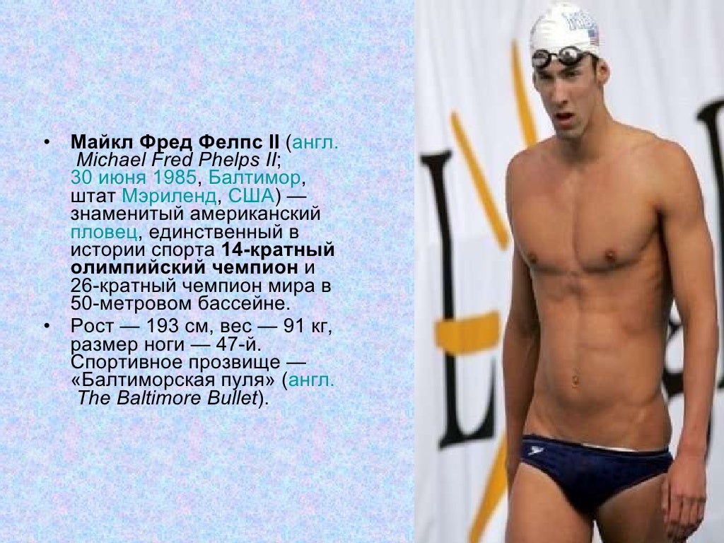 Рост — 193 см, вес — 91 кг, размер ноги — 47-й . . . . Майкл Фелпс на Олимпийских играх . . . На Олимпиаде в Пекине Фелпс выиграл все дистанции, на которых стартовал, и заработал 8 золотых наград, побив . . .