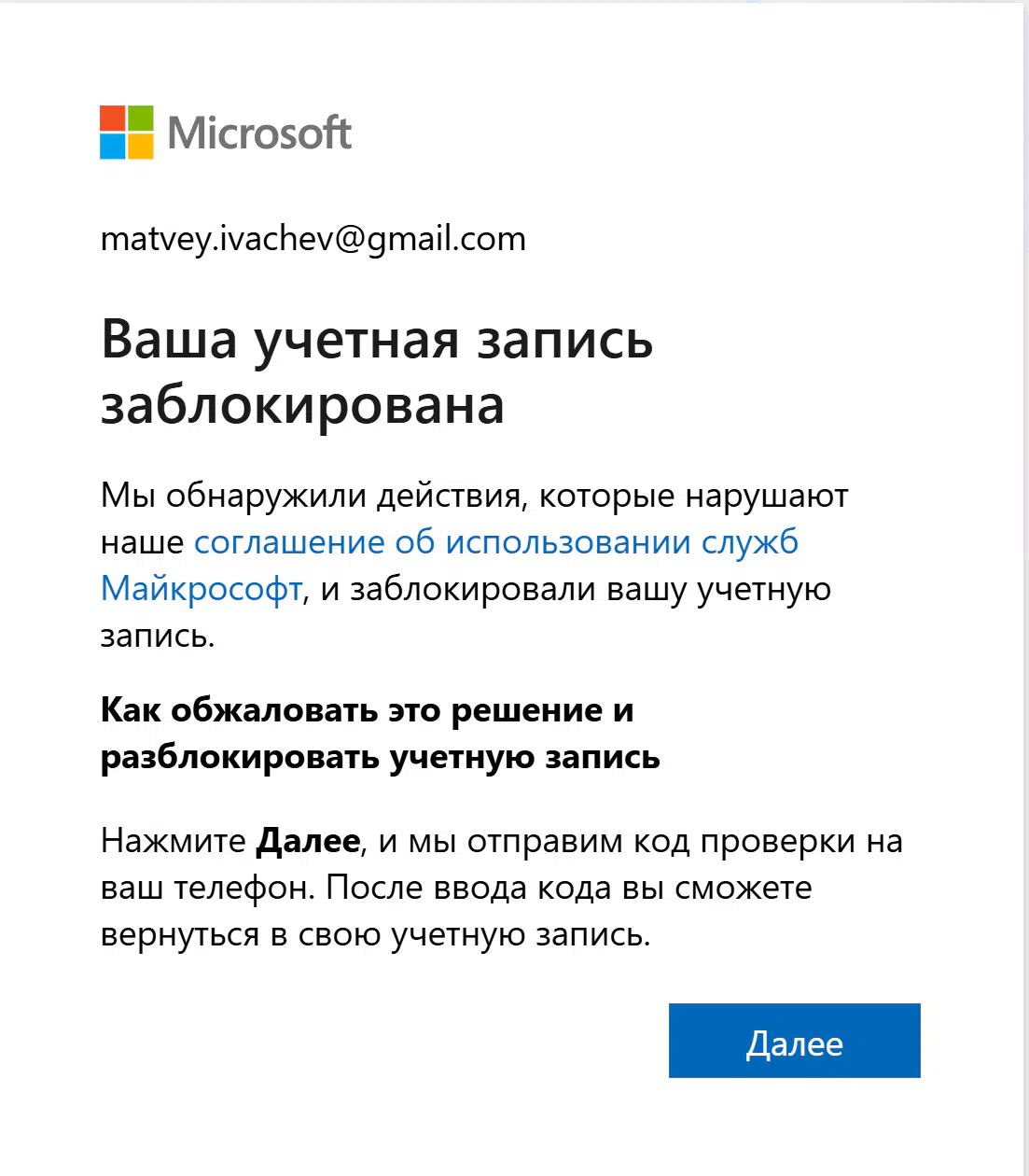 Майкрософт не присылает код