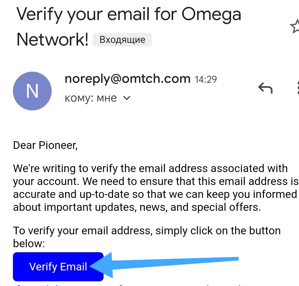 👆 Переходим в свою свиту, ищем письмо от Omega Network и нажимаем на кнопку Verify Email ✉️