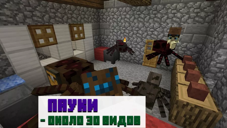Особенности мода на пауков в mcpe . На данный момент в Майнкрафт ПЕ существует всего две разновидности паукообразных, а именно — обыкновенные и пещерные . Первый вид обитает на практически всех биомах обычного мира и нападает на игроков в ночное время, а днем является . . .