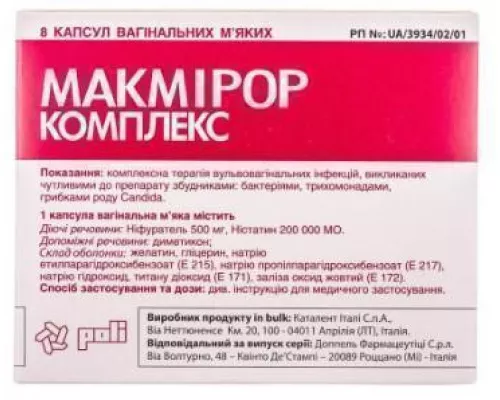 Макмирор Комплекс - комбинированный антимикробный препарат широкого спектра для местного лечения инфекционных вульвовагинитов . Оказывает действие на различные виды бактерий, грибов и простейших (трихомонады и др .) . Применяется в лечении смешанных вульвовагинитов, включая бактериальный вагиноз, вагинальный кандидоз, аэробный вагинит, трихомониаз .