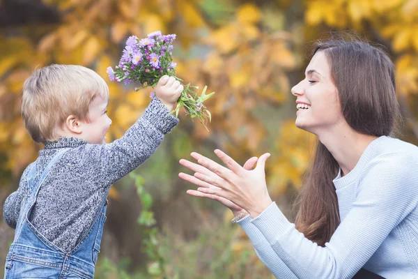 Мальчик дарит маме цветы — Стоковые изображения . . .
