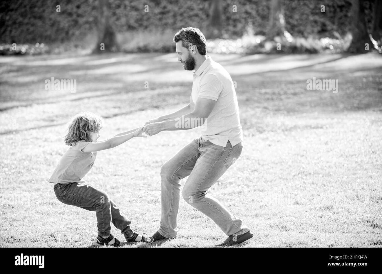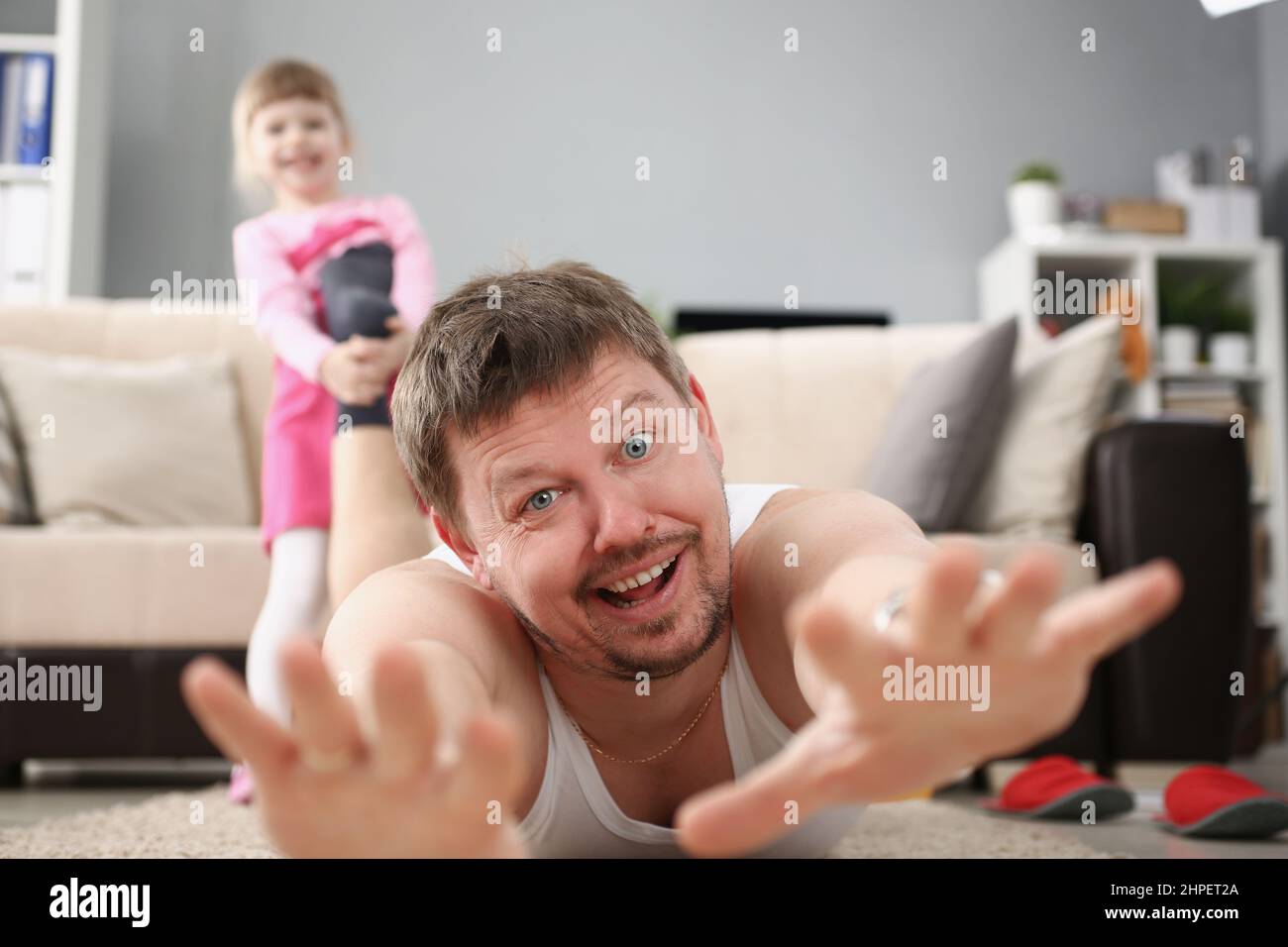 Мальчик несет папу за ногу