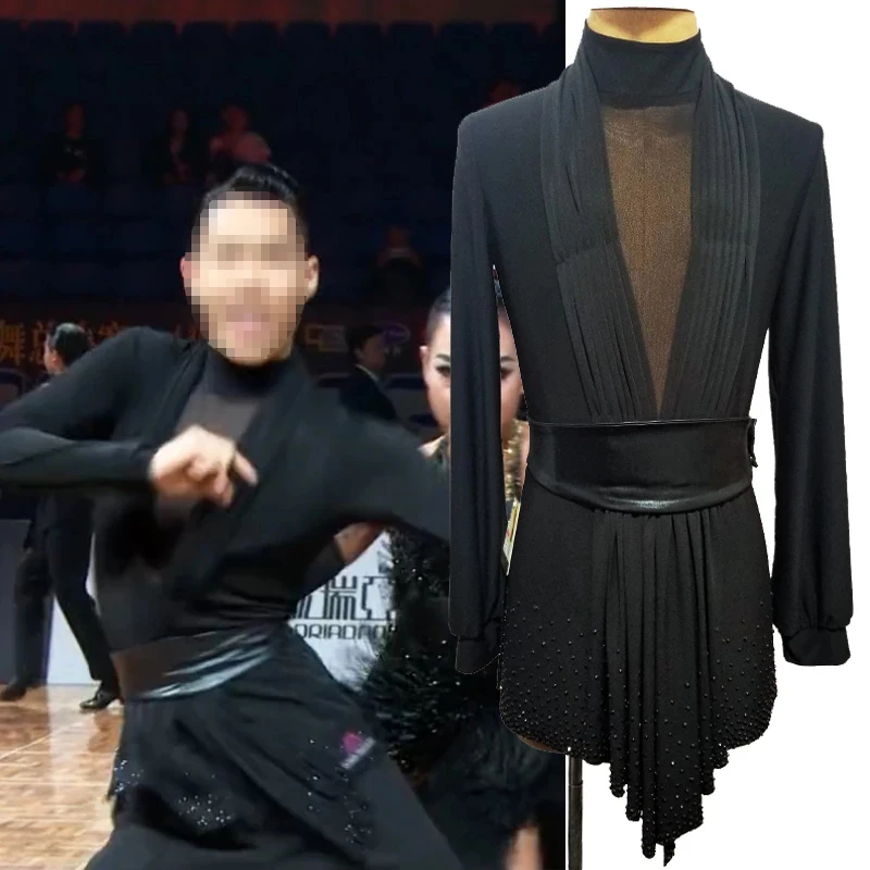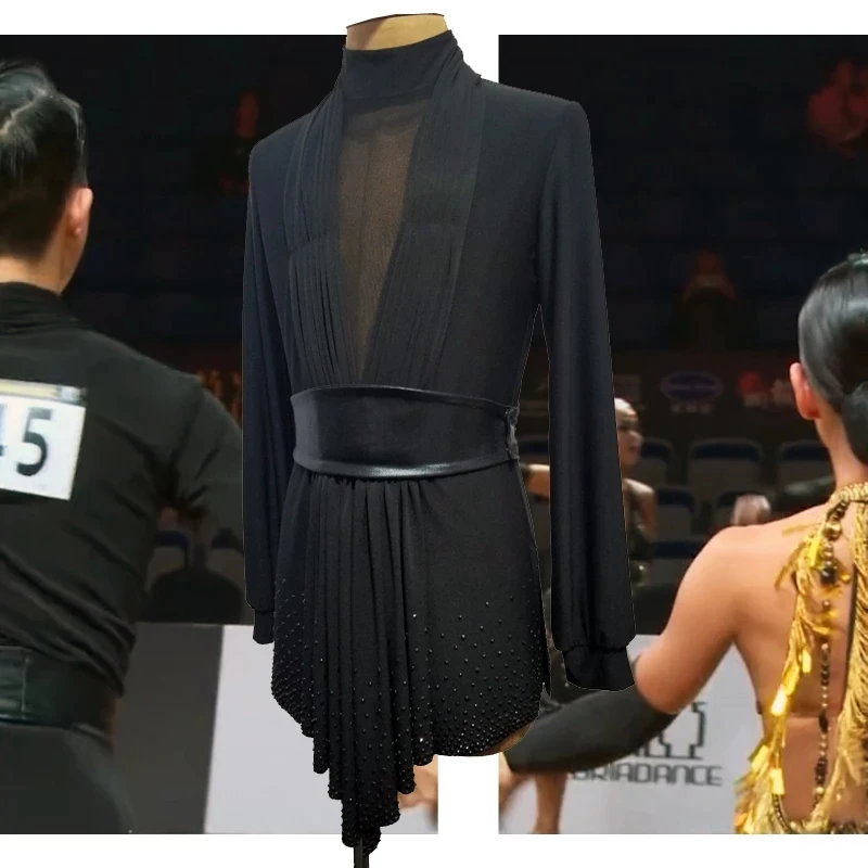 Male Latin Dance Competition Tops Black Rhinestone Ballroom Dance Shirt Adult ChaCha Tango Rumba Performance Costume VDB6248 - Купить с бесплатной доставкой
