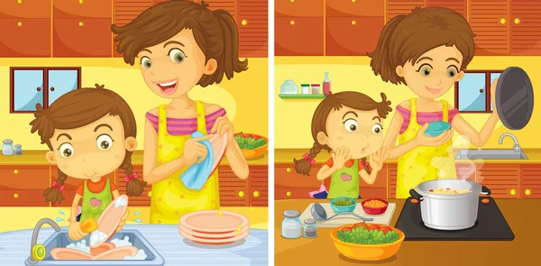 Маленькая девочка на кухне готовит а мама сидит в истерике . Папа вместо мамы . Мама встретила своего сына с прогулки . Дети отчитываются перед своей мамой о том как помыли посуду .