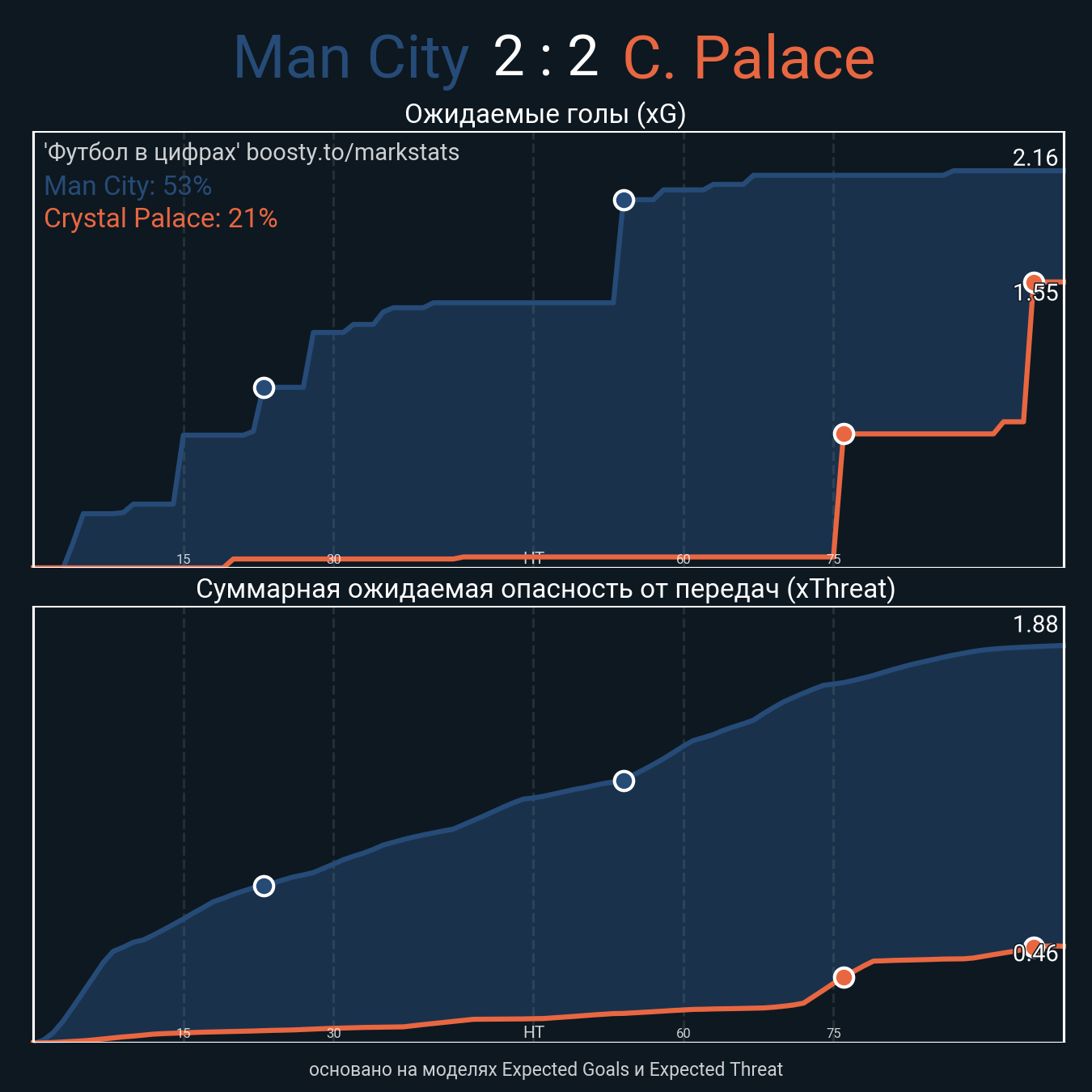 Ожидаемые голы (NPxG): 2.16 - 0.79